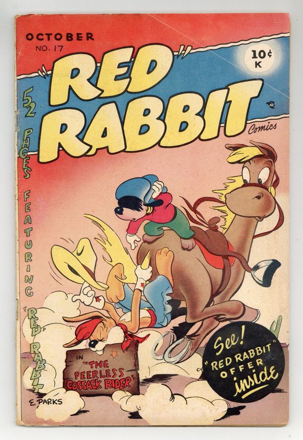 Cover by Etta Parks. Art by Stan Louis and Bill Newton. Funny-animal comics featuring gunslinging Red Rabbit, bear cubs Willy and Nilly, Officer Mutt, and others in the classic mold. Red Rabbit dares to ride Pecos Pete's bucking bronco at the rodeo, but Pete sees a chance to get rid of Red for good. Bugsey Bear's houseboat adventure concludes, as the fierce natives boarding the boat turn out to be extras in a Hollywood movie. Hoppy the bunny wants L'il Tinker (an inventor skunk) to help him build a flying saucer, so they can claim a reward from the Texas State Fair (!). Red Rabbit; The Cruise of the Bugsey Bear Family; Jeanie and the Champion; Little Buck; Pete and Tweet; Paddy Pelican; L'il Tinker. 48 pages, Full Color. Cover price $0.10.