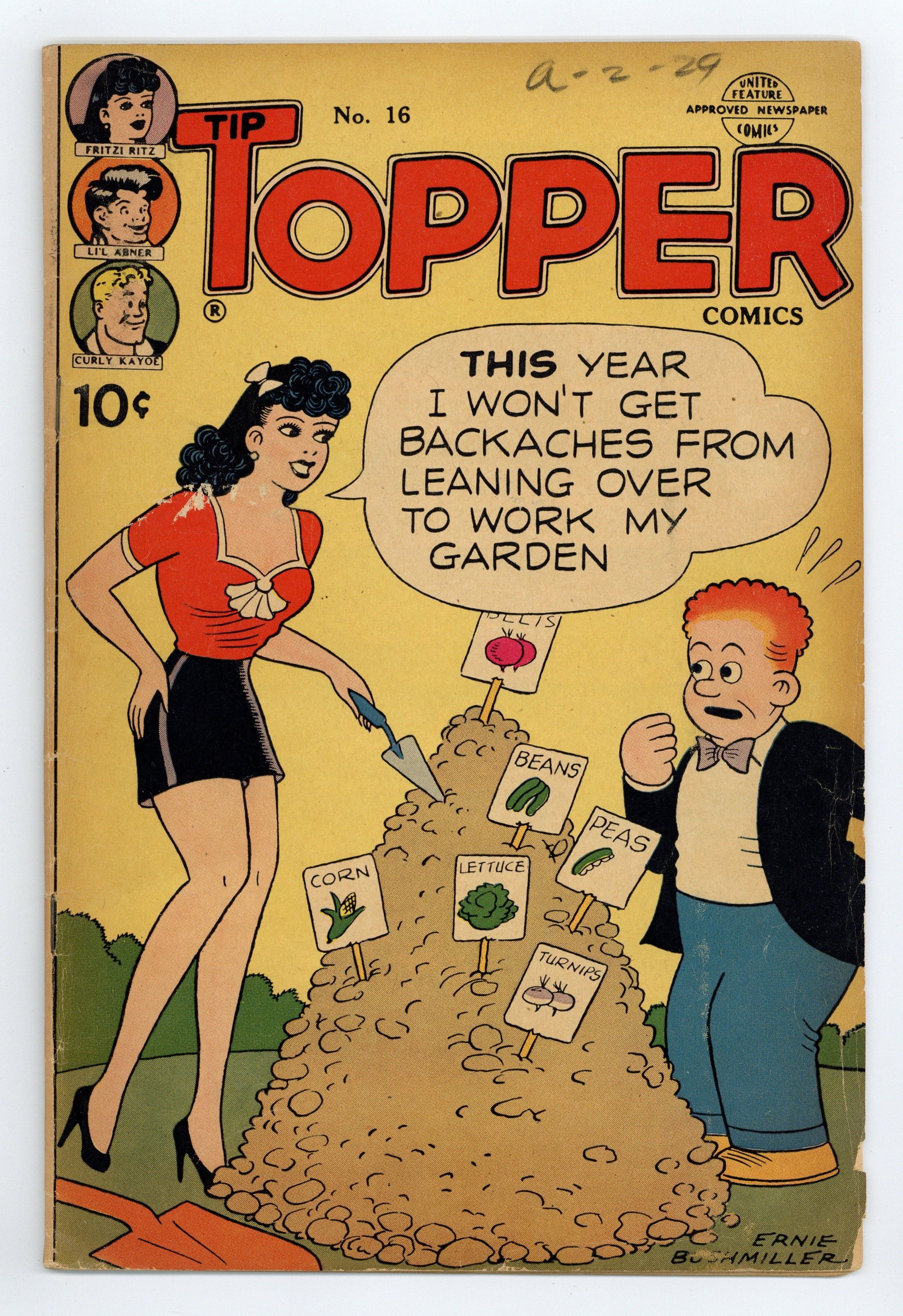 Cover by Ernie Bushmiller. Stories and art by Ernie Bushmiller, Charles Schulz, Al Capp, Sam Leff, and Henning Mikkelsen. Tip-Topper Comics collected some of United Features Syndicates most popular comic strips of the 1940s in full color, including Lil Abner and Fritzi Ritz. Fritzi was later known as "Aunt Fritzi" in the Nancy comic strip. Phil and Fritzi's boring dude-ranch vacation becomes a breathless chase after Phil accidentally lassos a moose. This issue is noteworthy as being the third comic book (after Tip Top Comics (1936) #173 and United Comics (1940/1950) #21, tied for first place) to reprint Charles Schulz's beloved Peanuts comic strip, then only in its third year. Curly Kayoe becomes involved with Grace's center for troubled boys, and mixes it up with gangster Mooch. Surprising Smith wants to marry Daisy Mae, in a Li'l Abner storyline by Al Capp. Fritzi Ritz; Peanuts; Li'l Abner; Curly Kayoe; Ferd'nand; Stamp Tips. 32 pages, Full Color. Cover price $0.10.