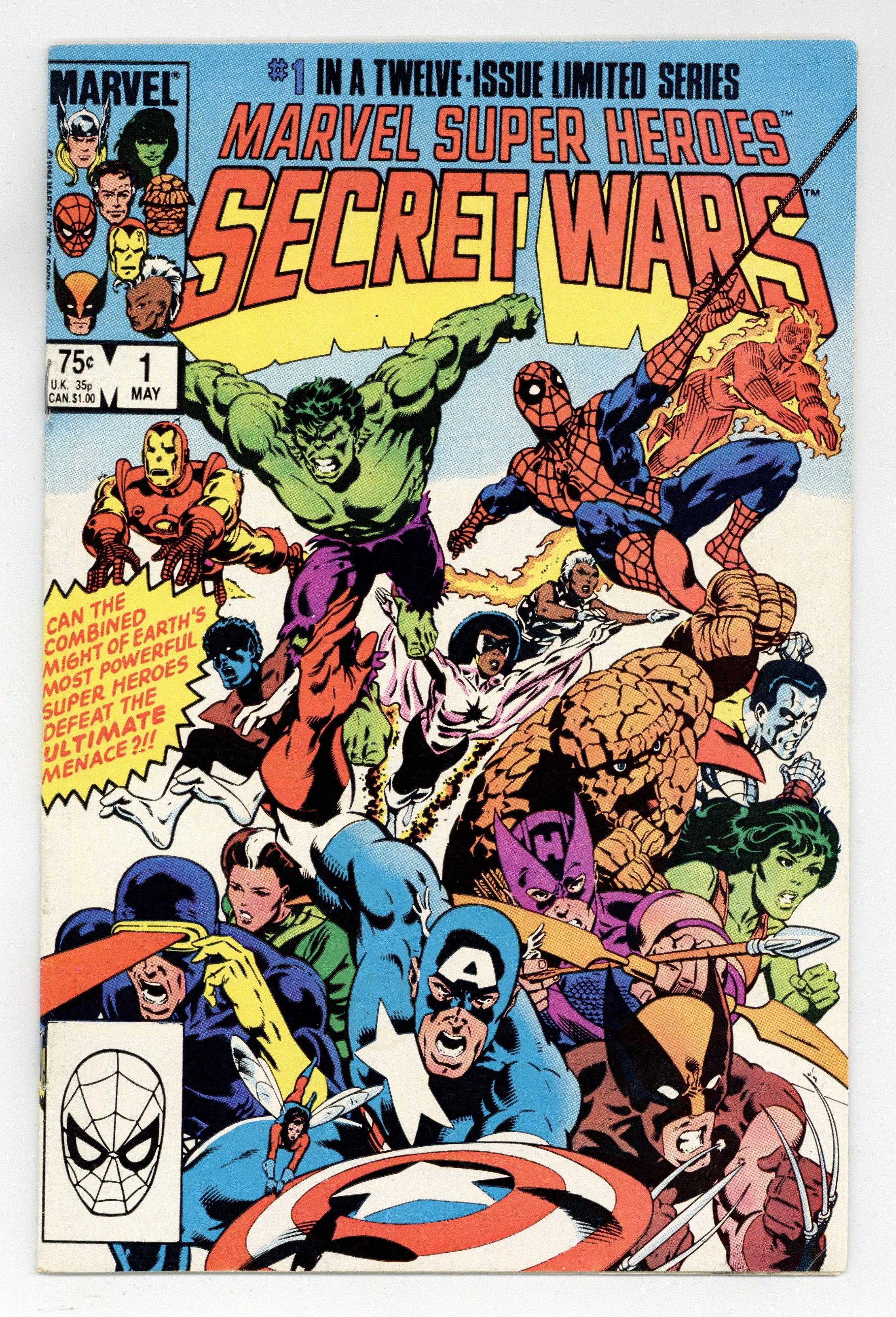 Direct Edition. "The War Begins!" Part 1 of 12. Story by Jim Shooter. Art by Mike Zeck and John Beatty. This is it, the granddaddy of all epic events. Before Identity Crisis, Infinite Crisis, House of M, Civil War, and Infinity Gauntlet there was Secret Wars. A nigh omnipotent being from beyond has, for lack of a better word, kidnapped the greatest heroes and deadliest villains in the Marvel Universe and whisked them to the far side of the universe to battle for the ultimate prize. One thing is for certain, the lives of these heroes and villains will never be the same again. - This is the first printing. Any 2nd printing will have the words "Second Printing" at the bottom of the first page. NOTE: Nearly all first printings contain a "Blue Galactus" from a printing error (a lack of magenta printing plates) that was corrected in later printings. While small number of First printings may have the correct colors, the majority of copies will have "Blue Galactus". Due to the frequency, "Blue Galactus" variants should be treated the same as other First Printings. 36 pages, full color. Cover price $0.75.