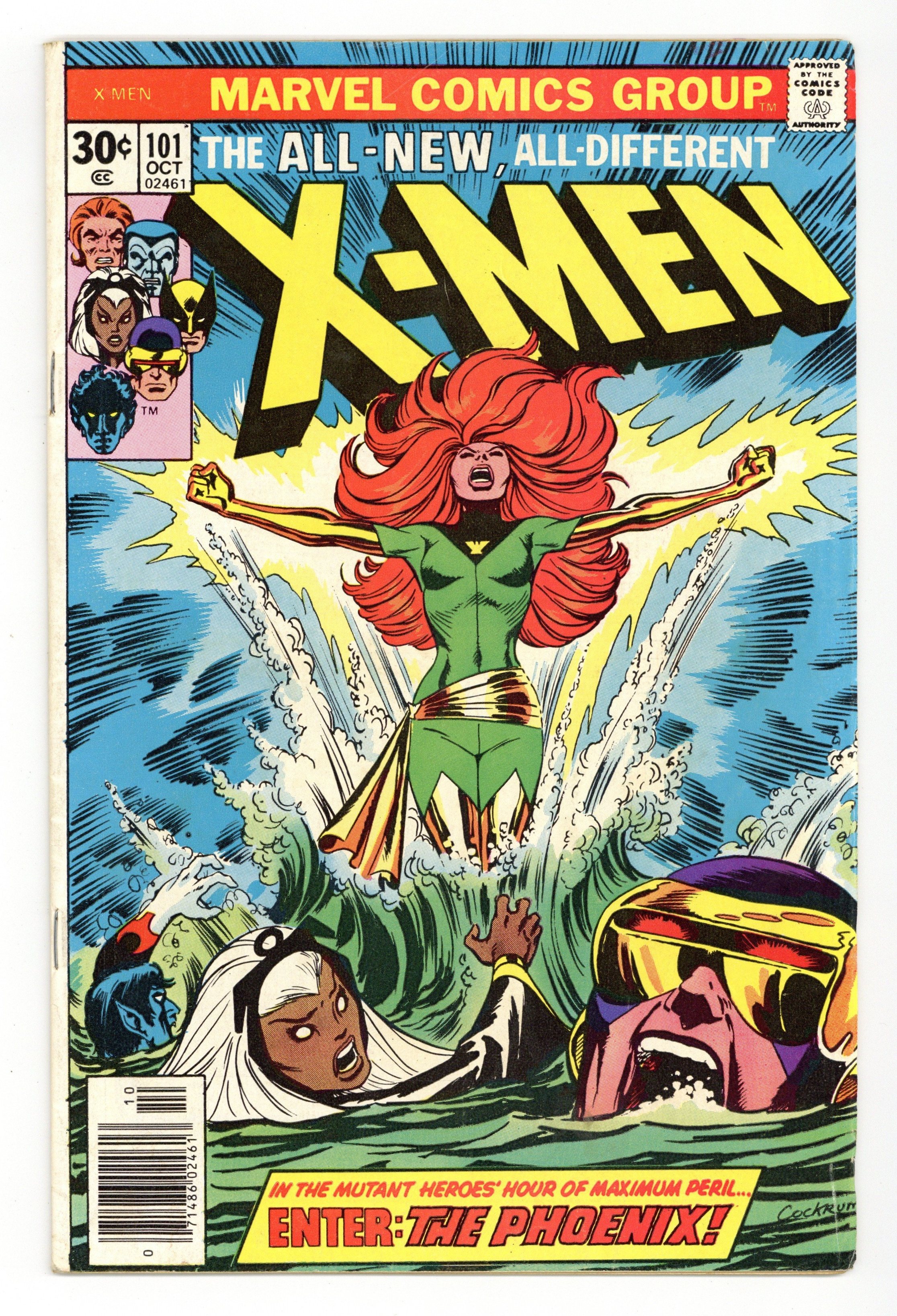 "Like a Phoenix, from the Ashes!" Part 1 of 3. Story by Chris Claremont. Art by Dave Cockrum and Frank Chiaramonte. In the startling aftermath of last issue's events, the X-Men crash-land back on Earth, but they soon learn that a unbelievable change has come over Jean Grey. Don't miss the rise of the Phoenix! Meanwhile, the team decides to take in some much needed R&R. They head to Ireland to Banshee's ancestral home. However, nothing but danger and death wait for them here. 36 pages, full color. NOTE: 1st appearance of Phoenix, 1st appearance of Black Tom Cassidy, and Juggernaut cameo. Cover price $0.30.