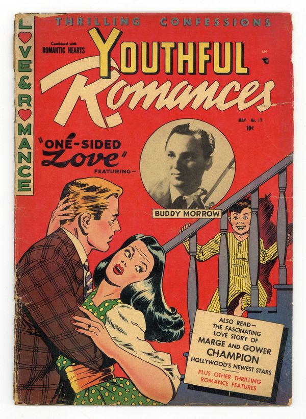 Cover by William Zeller. Stories and art by Ira Zweifach, Martin Smith, Richard Akin, Beresford King, Jesse Merlan, Bob Cohen, Alvin Hollingsworth, Walter Palais and Tony Tallarico. Tales of love and heartbreak, with a twist: in-story appearances by real-life musicians of the era. Sometimes listed as Youthful Romances (1953-54 Ribage) #3. Real-life American trombonist and bandleader Buddy Morrow saves a young woman from drowning and helps her patch things up with her boyfriend. Lily is the new girl in school, and her shameless flirting creates a trail of broken hearts, hurt feelings and even a suicide attempt, in an apparent cautionary tale against flirting. Helen falls in love with both John and the house he's building, but when she sees him with another woman, she literally sets the place on fire. Plus a profile of Hollywood legends Marge and Gower Champion. Cover features a photo of Buddy Morrow. One-Sided Love; Strictly Business!; Heartless Flirt!!; Marge and Gower Champion; House of Dreams. 32 pages, Full Color. Cover price $0.10.