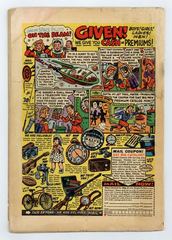 Cover art by Joe Maneely. The Eyes, art by Pete Tomlinson. The Rulers of Earth, art by Joe Sinnott. The Death of Me, art by Al Carreno. The Future of Oswald Flush!, art by Ed Winiarski. Until You Are... Dead!, art by Tony DiPreta; Gangster Killer Ryan forces biochemist Dr. Knight to create an antidote for poison gas so the criminal can avoid execution in the gas chamber; But the antidote alters Ryan's metabolism so he can only breathe poison gas. 36 pgs. $0.10. Cover price $0.10.