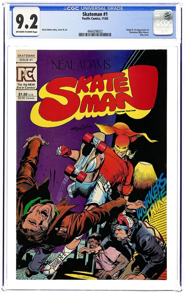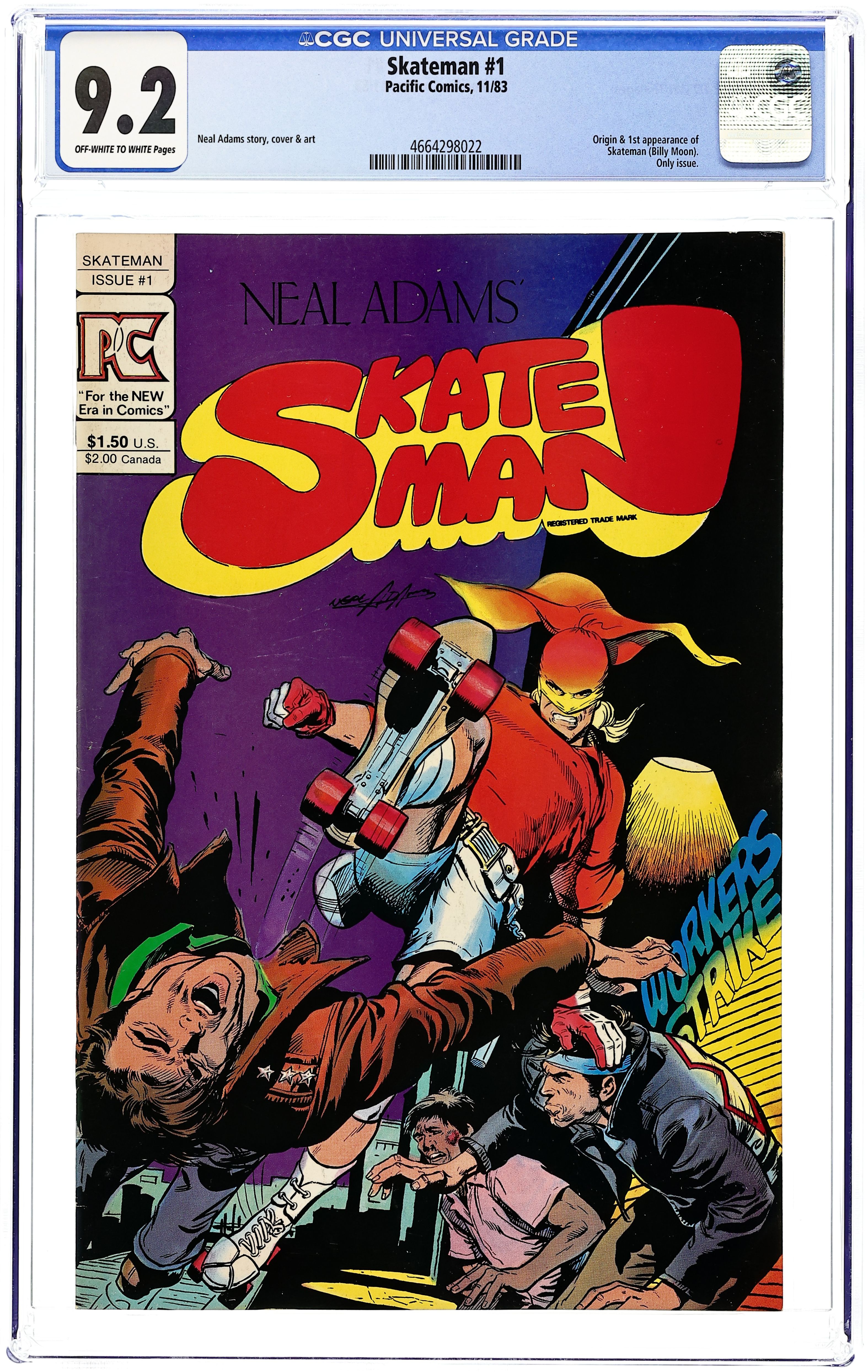 Stories by Jack Arata, Paul S. Power and Neal Adams. Art by Andy Kubert, Jack Arata, Paul S. Power and Neal Adams. Cover by Neal Adams. A swing and a miss from legendary artist Neal Adams. When a roller-derby star's friends are murdered, he decides to use his natural skating ability to avenge their deaths as the hero Skateman. Just as goofy as it sounds, with references to fads (like roller-discos) that were no longer around in 1983. Also featuring Paul Powers Rock Warrior, who battles aliens with the power of his guitar. Skateman was later listed in Jon Morris's League of Regrettable Superheroes book. Inks by future superstar artist Andy Kubert. Skateman; Futureworld; Rock Warrior. 32 pages, Full Color. Cover price $1.50.