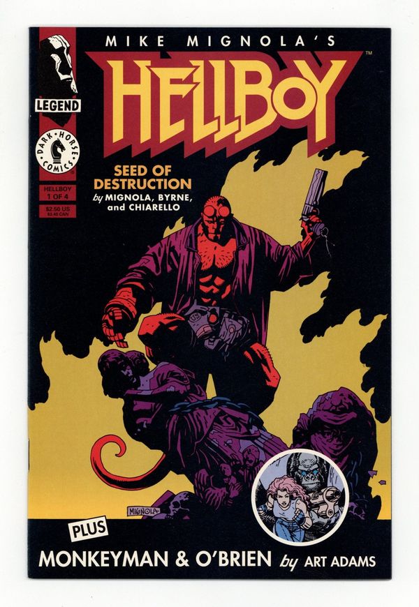 Written by Mike Mignola and John Byrne. Art by Mike Mignola. Hellboy bursts onto the film noir monster detective scene. From his apocalyptic origin in WWII England to the modern-day case of the sole survivor of a doomed Arctic expedition, Hellboy must battle vampire frog creatures and worse in his debut miniseries. Created by Mike Mignola, with script by John Byrne, and colors by Mark Chiarello. Hellboy -- World's Greatest Paranormal Investigator. Also featuring chapter one in the astounding origin of Monkeyman and O'Brien, the most dynamic duo since a talking scientific genius (who also happens to be an ape) and a beautiful, super-strong blonde (who also happens to be a scientist) teamed up to battle extra-dimensional menaces while looking for a way to return Monkeyman to his home dimension! Story and art by Arthur Adams. 32 pages, FC. Cover price $2.50.