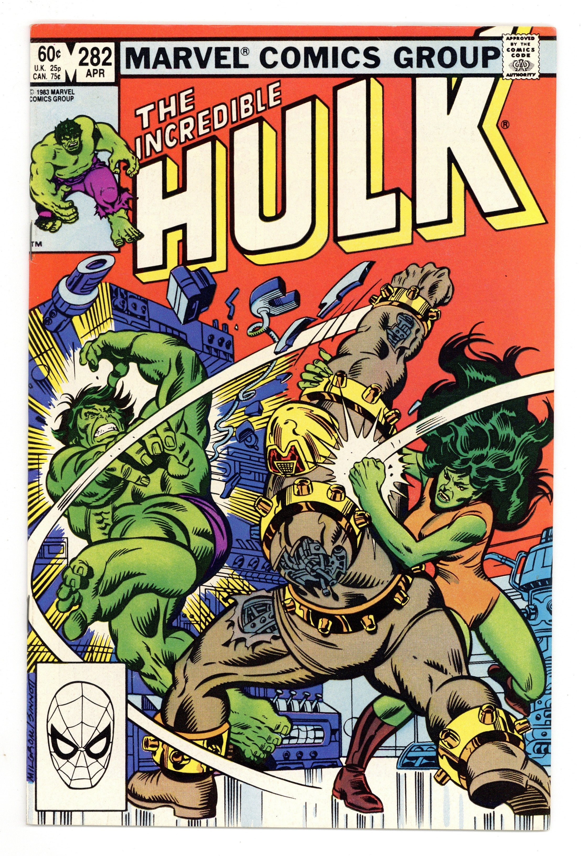Tags: Marvel Legacy Numbering: Hulk (part 282), Hulk$23.00Direct Edition. Cover pencils by Al Milgrom, inks by Joe Sinnott. "Again, Arsenal," script by Bill Mantlo, pencils by Sal Buscema, inks by Sinnott; The story opens with the Leader sitting at his computer aboard Omnivac, his orbiting space station, plotting ways to conquer the world, now that he believes the newly intelligent Hulk, finally under the control of Bruce Banner, is no longer a threat; Back at the Empire Hotel, Tony Stark is informed by the management that Bruce Banner and his friends can no longer stay at the hotel after it was trashed in last issue's battle with the Leader; They relocate to Avengers Mansion to avoid more civil destruction; There, Bruce Banner helps Iron Man search for Ommivac, using Stark's Omnifunctional Detection Device; She Hulks origin is retold. 36 pgs., full color. $0.60. Cover price $0.60.