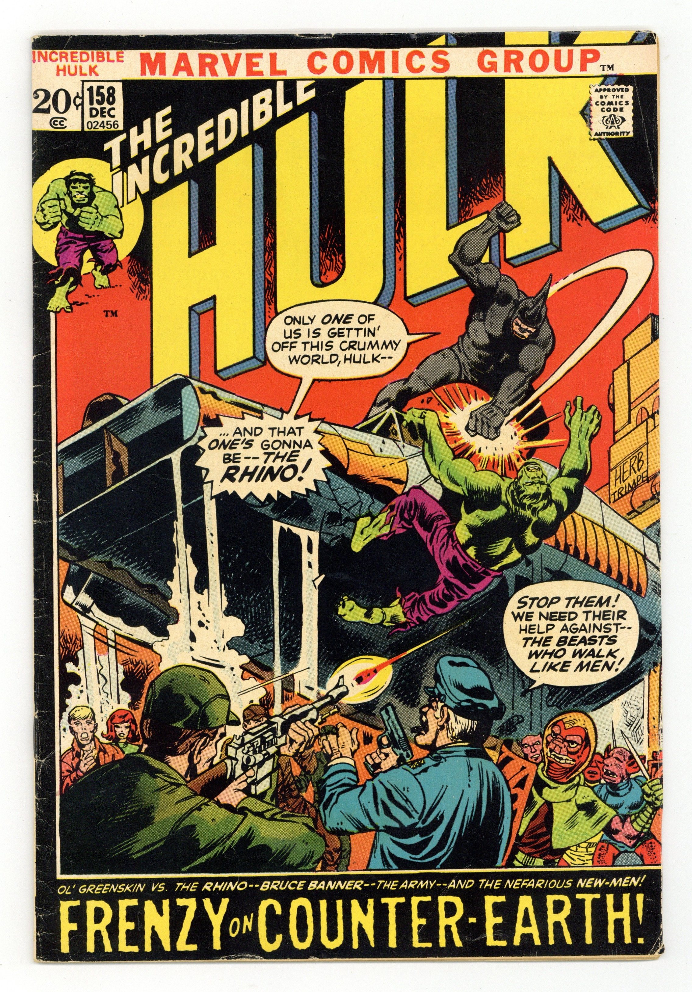 Cover art by Herb Trimpe. Frenzy On a Far-Away World!, script by Roy Thomas and Steve Gerber, pencils by Herb Trimpe, inks by Sal Trapani; While Hulk takes a trip to Counter-Earth where he battles the Rhino, gets involved in a New Men civil war and meets his counter alter ego (Bruce, his wife Betty and their son Bobby), back on his own Earth, Betty Ross and Glenn Talbot are busy getting married. 36 pgs. $0.20. Cover price $0.20.