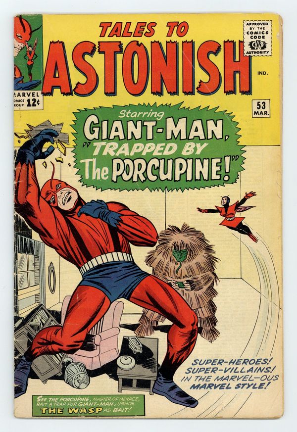 Cover by Jack Kirby and Sol Brodsky. Trapped by the Porcupine!, script by Stan Lee, art by Dick Ayers; The Porcupine uses Giant-Man's fan club to attack him and then he captures the Wasp. The Clock text story. When Wakes the Colossus!, script by Stan Lee and Larry Lieber, art by Larry Lieber and Don Heck; An alien warlord builds a giant statue to intimidate the superstitious, but it comes to life and takes the side of the rebels against him. 36 pgs., full color. $0.12. Cover price $0.12.