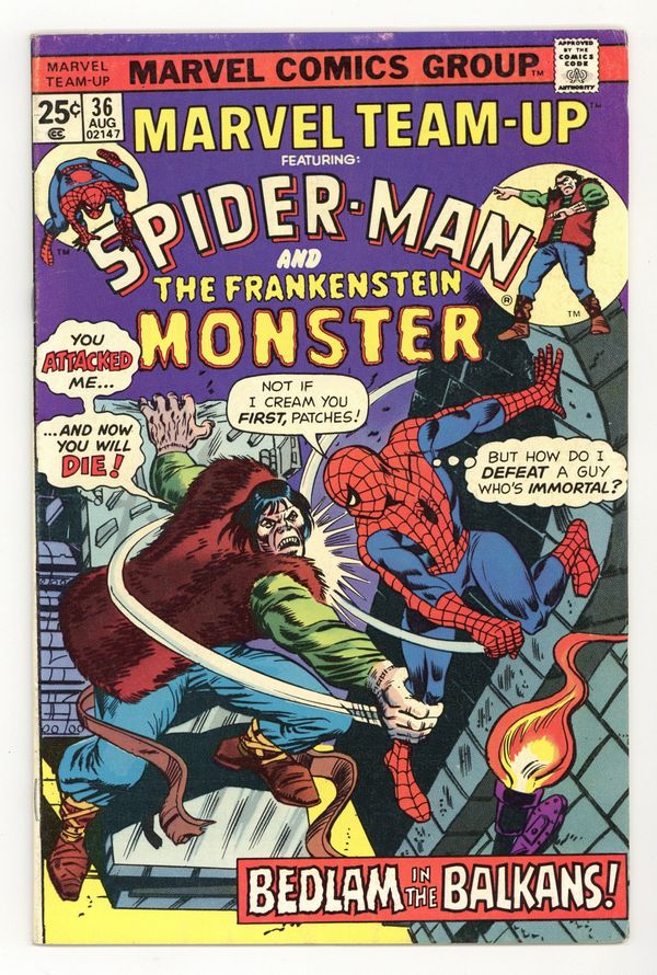 Tags: Spider-Man$15.00"Once Upon a Time, in a Castle" Part 1 of 2. Guest-starring Spider-Man and the Frankenstein Monster. Script by Gerry Conway. Art by Sal Buscema (layouts) and Vince Colletta (finishes). Cover by Ed Hannigan and Mike Esposito. At some point in high school, Peter Parker probably read Mary Shelley's classic novel "Frankenstein." At no point though did Peter think he might someday team up with Victor Frankenstein's creation! But due to a strange series of events, the Amazing Spider-Man finds himself across the Atlantic Ocean, in the Balkans, and inside the castle of the evil Baron von Shtupf...with only one friend by his side: the Frankenstein monster! It's a literary team up for the ages as the wondrous wall-crawler and the man-monster from the pages of a 19th century novel join forces...to save the world! Cameo appearance by the Man-Wolf. (Notes: Frankenstein previously appeared in Frankenstein Monster 18. This issue includes a 2-page retelling of the origin of Frankenstein's monster.) 36 pages. Cover price $0.25.