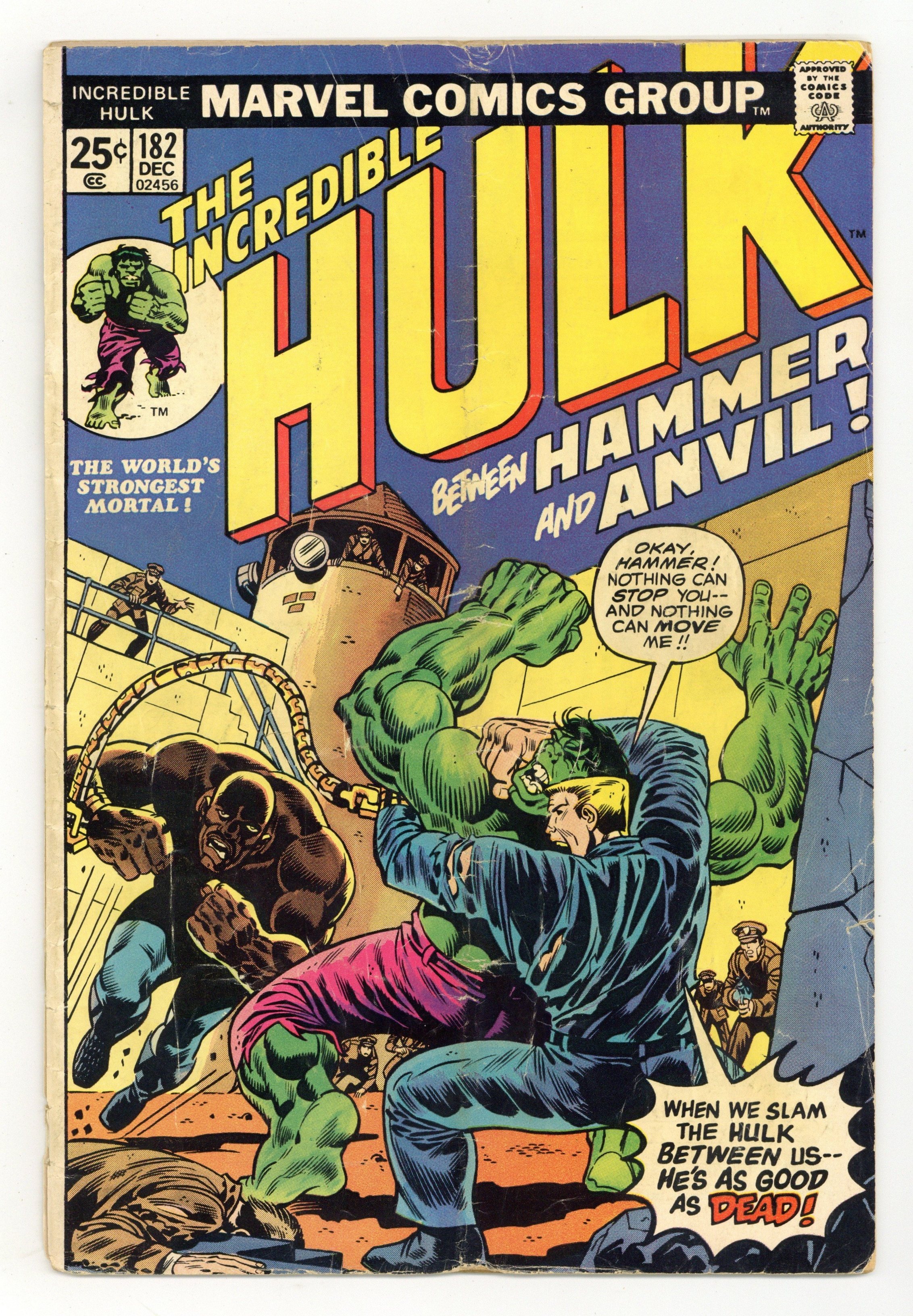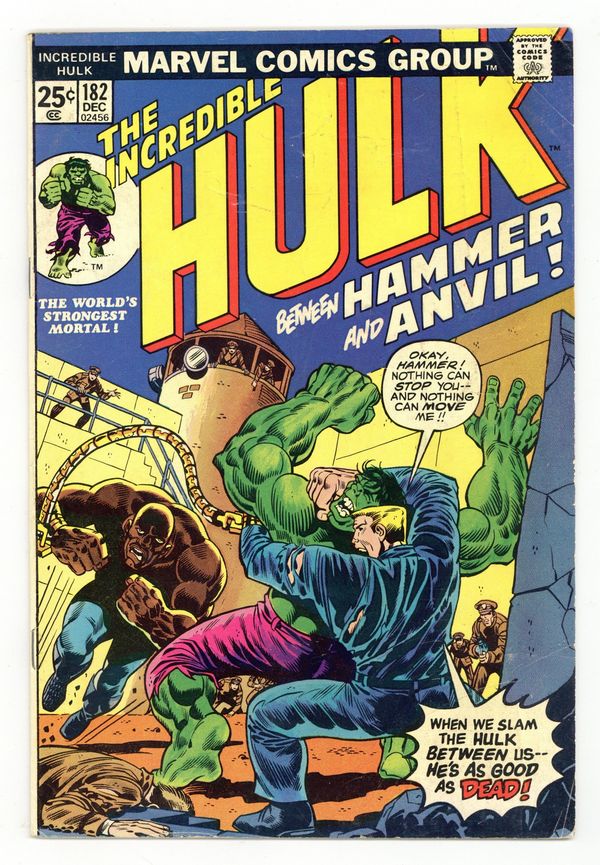Cover art by Herb Trimpe. First appearance of Hammer and Anvil in "Between Hammer and Anvil!," script by Len Wein, art by Herb Trimpe; The Canadian government reins agent Wolverine back in from his unaccomplished mission of destroying the Hulk; He reluctantly retreats, and they send their special-op commandos to take on the brute; When even that doesnt work, they detonate a huge sleeping gas bomb at him, which finally puts the Hulk out; When the Hulk comes to, he is flying high above the forest, carried by the agents in a steel cage; The Hulk angrily breaks free of his prison, and jumps away to safer pastures. Next Wolverine in Giant-Size X-Men #1. Marvel Value Stamp Series A: The Golem. 36 pages, full color. Cover price $0.25.
