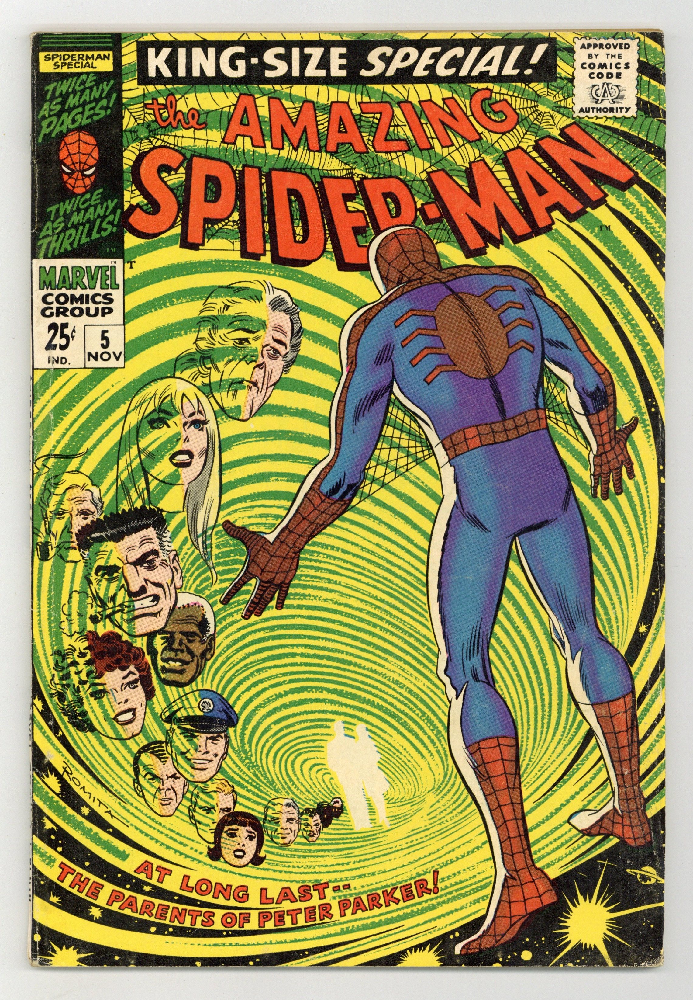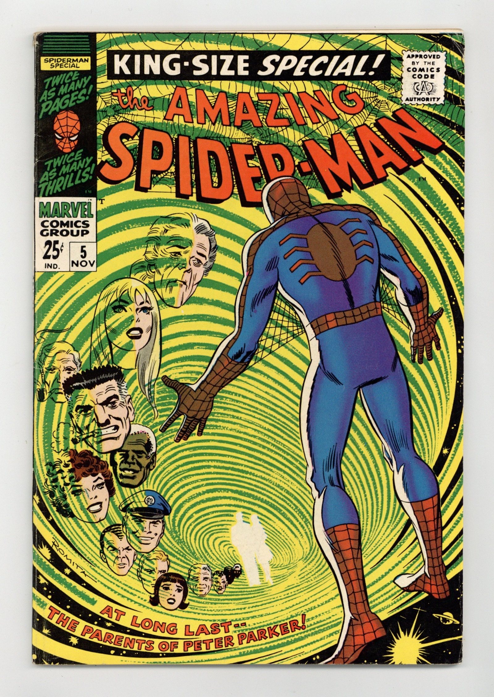 First printing and first appearances of Richard Parker and Mary Parker in an all-new 40-page story "The Parents of Peter Parker!" Script by Stan Lee. Pencils by Larry Lieber. Inks by Mike Esposito (aka Mickey Demeo). Consulting by John Romita (layouts). Cover by John Romita. While moving an old trunk in his Aunt's house, Peter finds pictures and newspaper clippings of his deceased parents. Apparently they were considered traitors by the U.S. government before their deaths in a plane crash in Algeria almost two decades ago. After Aunt May provides a few more details, Peter vows to uncover the truth about his parents! To that end the web-slinger links up with the Fantastic Four and flies to North Africa! In the middle of the Kasbah, the Amazing Spider-Man finally comes face-to-face with the man who framed his parents: the sinister Red Skull! Wow, can the wall-crawler exonerate his parents and change his family legacy forever? Or will the spectacular son meet the same fate as his father...at the hands of the Red Skull? A terrific story! Cameo appearances by the Human Torch, Mr. Fantastic, and the Thing. Flashback cameo by Ben Parker. (Notes: This story features the second Red Skull (aka Albert Malik). He appears many years later in Solo Avengers 6 and Captain America 347.) First backup feature: "A Day at the Daily Bugle" One-page illustration of the Daily Bugle newsroom with J. Jonah Jameson, Joe Robertson, Ned Leeds, and Betty Brant. Script by Stan Lee. Pencils by Larry Lieber. Inks by Mike Esposito. Assists by John Romita. Second backup feature: "Peter Parker, the Super Sports Star!" Two-page illustration of the web-slinger as a baseball player and football player. Third backup feature: "Where It's At" One-page drawing of Spider-Man's usual hangouts. Fourth backup feature: "This is Spidey as We Know Him, But--" Two-page illustration of other publications' characters dressed as Spider-Man. Fifth backup feature: "Here We Go-a-Plotting!" Three-page parody of the Marvel Bullpen starring Stan Lee, Larry Lieber, and John Romita. Script and Pencils by Marie Severin. Inks by Frank Giacoia. (Notes: The inside front cover features selected artwork from the story. The issue includes a full-page ad for Spectacular Spider-Man (1968) Magazine 2. A second printing of this issue was published in 1994 and only available through JC Penney stores. This story was reprinted in Marvel Tales 264 & 265.) 68 pages. 25 cent cover price. Cover price $0.25.