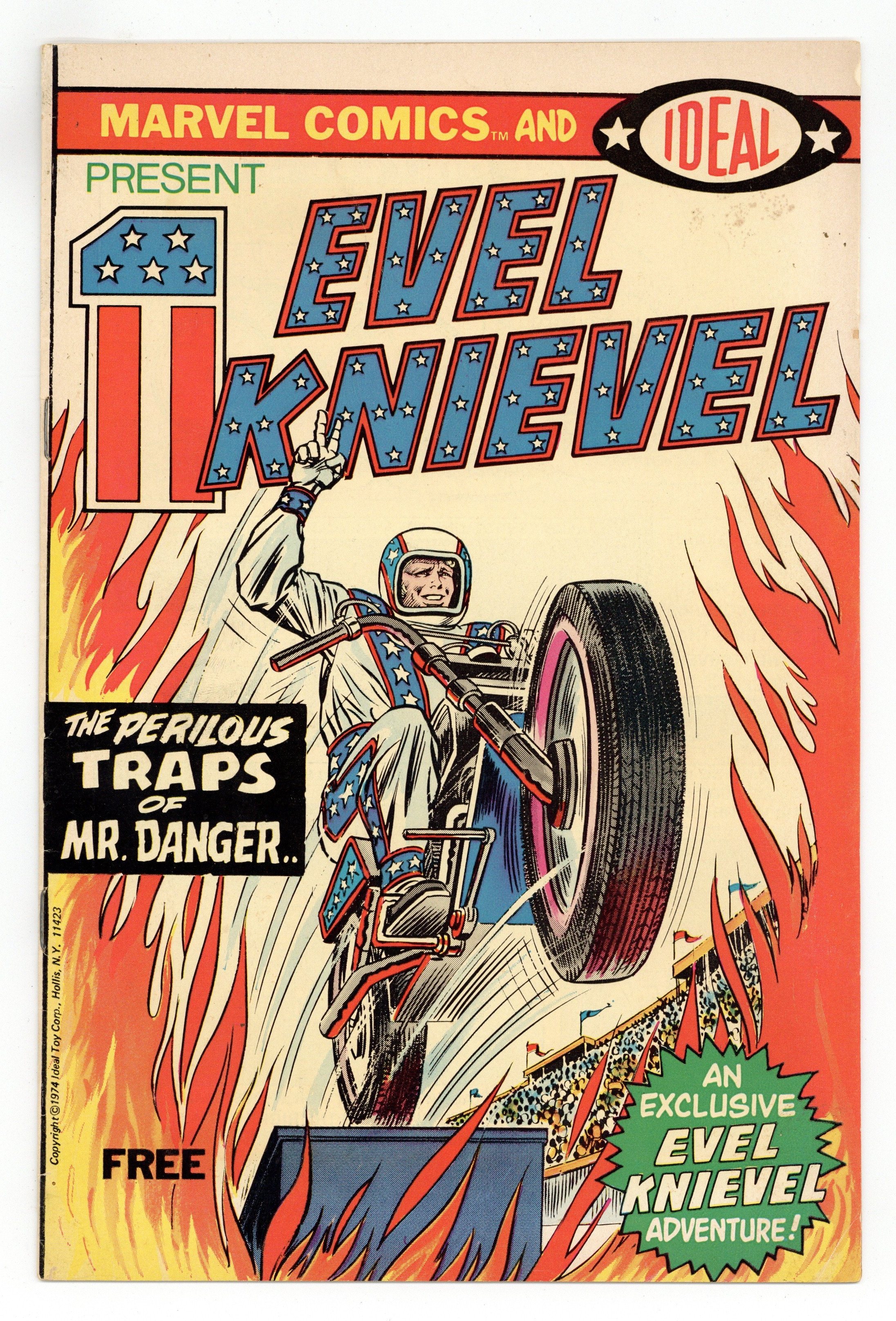 Cover by John Romita. Evel Knievel Bicycle Safety public service announcement. The Perilous Traps of Mr. Danger!; Evel Knievel prepares for a stunt in southern Florida, but someone stands in his way. Evel Knievel pinup photo. Ad for Ideal Evel Knievel toys. Comic-sized freebee. 20 pgs., full color.