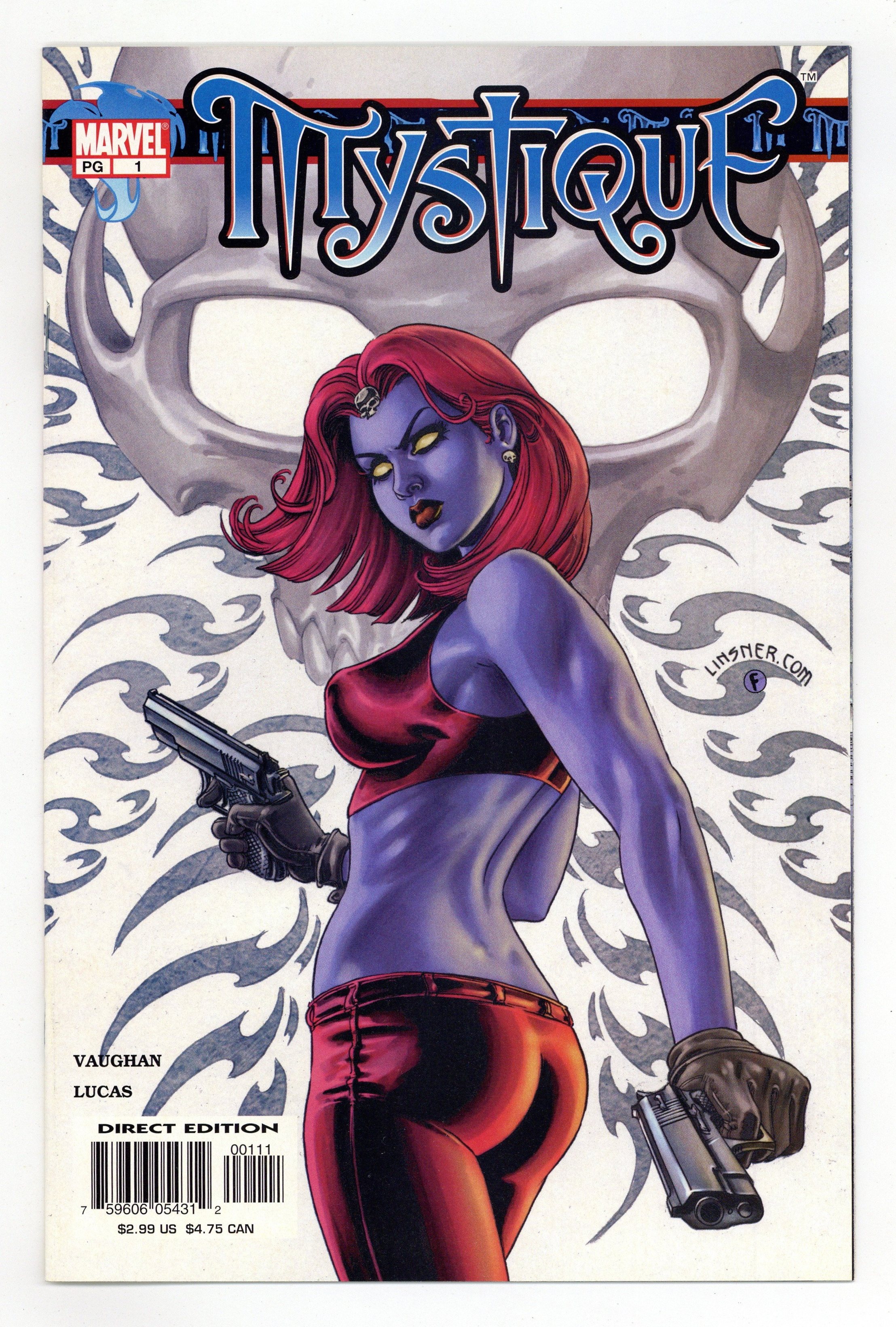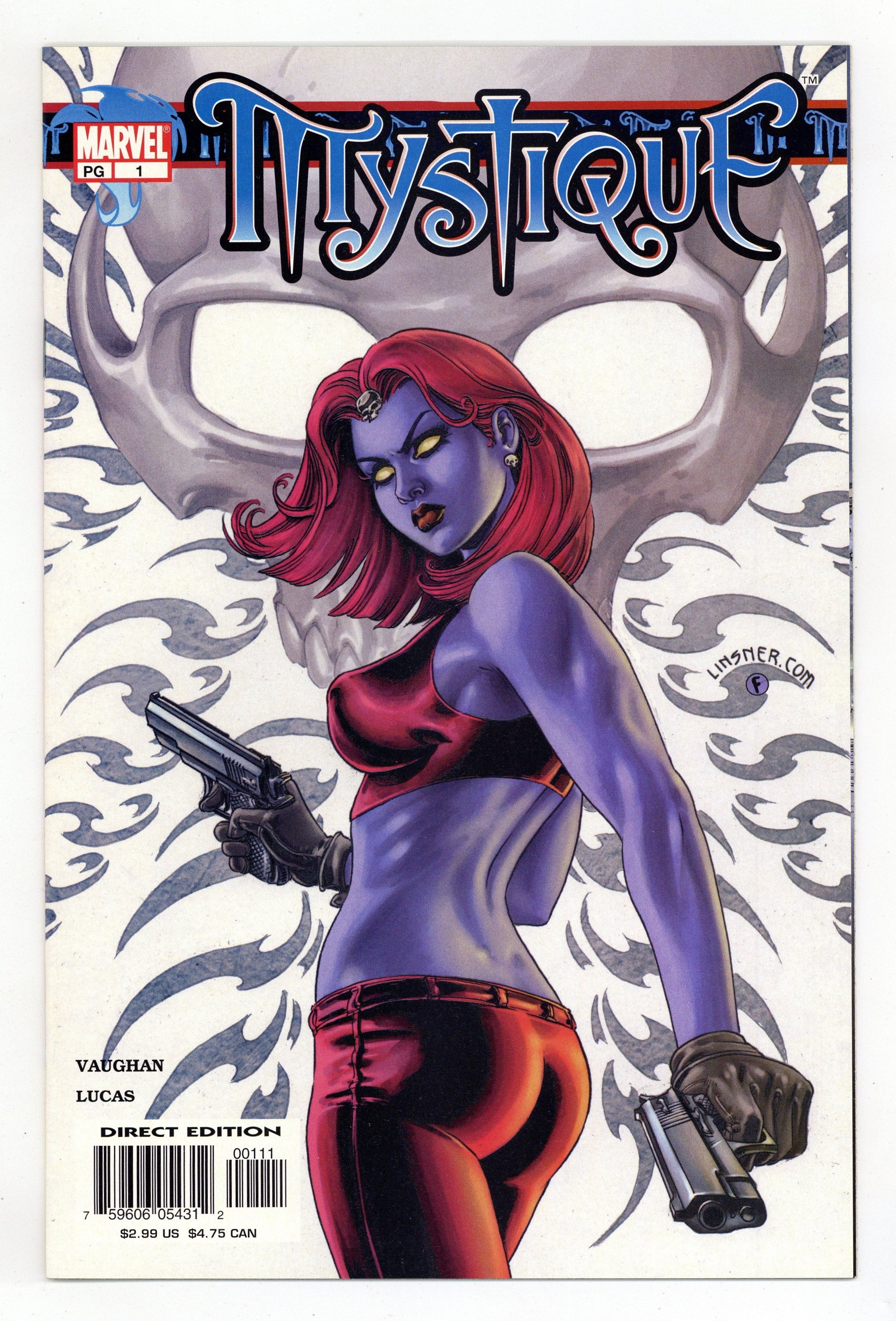 DEAD DROP GORGEOUS: Part 1 of 6 - Cover by Joseph Michael Linsner Brian K. Vaughan (w)/Jorge Lucas (p) Mystique can be anything you want her to be... In a world of intrigue and seduction, where mutants are feared and hated and the X-MEN are not enough to protect them, Mystique uses her shape-shifting abilities to further her own mutant rights agenda. And to get want she wants, she's not afraid to do WHATEVER's necessary. Mystique's true motives are put to the test in this brand new beginning for the mutant chameleon. 32 PGS. WITH ADS/FC/MARVEL PG...$2.99 Cover price $2.99.
