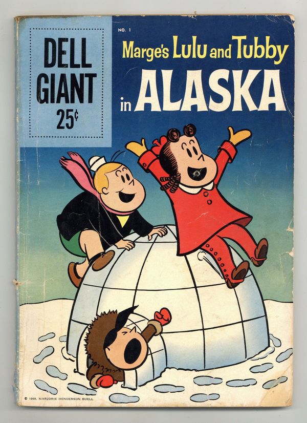 Dell Giant Marge's Lulu and Tubby in Alaska # 1. Little Lulu in "Alaska's Priceless Possession," "Au Revoir But Not Good-Bye," "The One-Man Smuggling Ring," "Bumpy Flight," "The Gold Rush," "First-Class Gadget Catcher," "Little Lulook and the Hand-Painted Whale," "The Spider and the Red Seal," "The Little Girl and the Broken Klondike," "No Tub Allowed," "Ol' Witch Hazel and the Frozen Totem Pole," "Ghost Town Ghost," and "Her Mark." Tubby in "Double Trouble." 100 Pages, Full Color. Cover price $0.25.