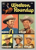 American Edition 25¢ cover price. Photo cover with Gene Autry, Roy Rogers, Johnny Mack Brown, Bill Elliott, and Rex Allen. Gene astride a sitting Champion photo. Gunfighter's Retreat starring Roy Rogers, art by Peter Alvarado; Roy encounters a "retirement" home for old gunfighters. Dictionary of Western Terms. The Mustangers starring Trigger, art by Till Goodan. Short article about various breeds of horses. Nickel Plated Pay-Off starring Gene Autry, art by John Ushler. Words and music to the song Red River Valley. Killer Trouble starring Champion, art by Nicholas Firfires. Articles on rodeo. The Phantom Stage starring Johnny Mack Brown. The Pay-Off Bandit starring Wild Bill Elliott. Double Deception starring Rex Allen, art by Peter Alvarado. 100 Pages, Full Color. Cover price $0.25.