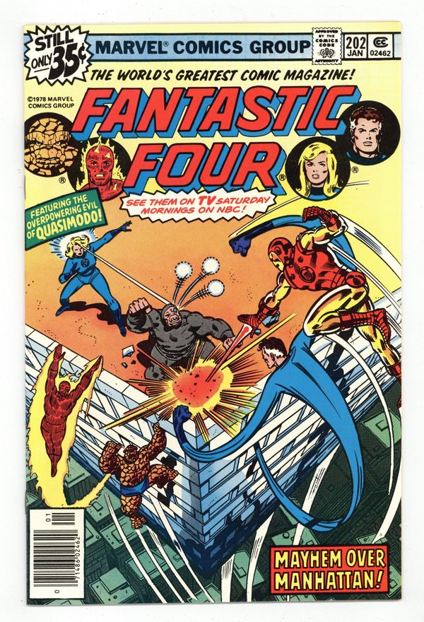 Tags: Fantastic Four, Iron Man$9.00"There's One Iron Man Too Many!" Part 2 of 2. Written by Marv Wolfman. Pencils by John Buscema. Inks by Joe Sinnott. Cover by John Buscema and Joe Sinnott. Guest-starring Iron Man. With the help of a pseudo-Iron Man, Quasimodo has incredibly stolen the top five floors of the Baxter Building and moved them to a tropical island! Now the FF and the golden avenger are in hot pursuit! It's an awesome battle between the Fantastic Four and Quasimodo! Notes: Quasimodo previously appeared in Marvel Team-Up 22. The letters page includes a letter from comics editor Cat Yronwode. 36 pgs. Cover price $0.35.