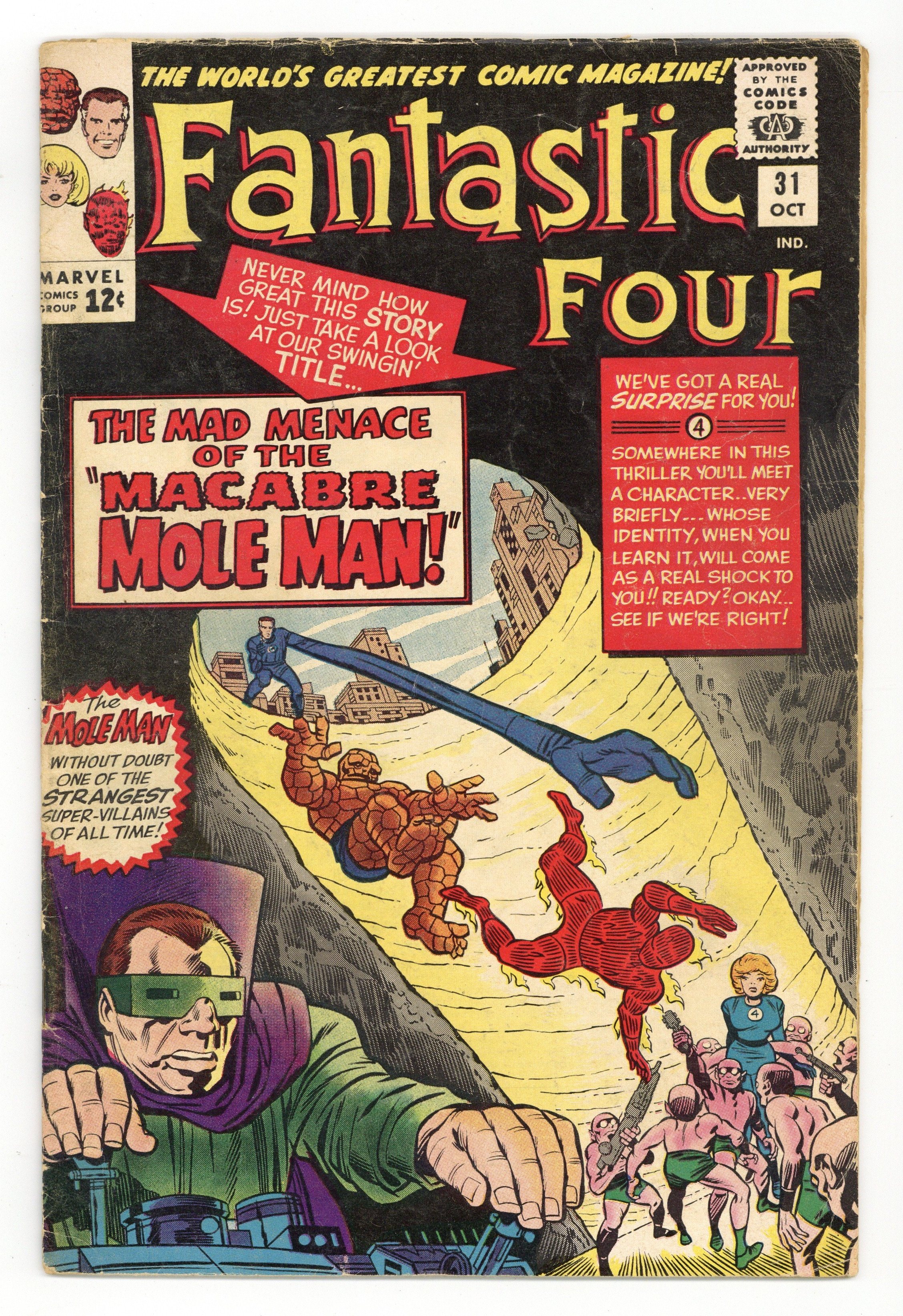 Cover pencils by Jack Kirby, inks by Chic Stone. The Mad Menace of the Macabre Mole Man!, script by Stan Lee, pencils by Jack Kirby, inks by Chic Stone; Mole Man lowers blocks of New York City into his realm; Sue is injured in the ensuing battle and can only be saved by a surgery performed by her escaped felon father. 36 pgs. $0.12. Cover price $0.12.