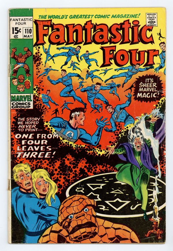 Tags: Fantastic Four$23.00Corrected color version (The Thing is not green, etc.). "One From Four Leaves Three!" Script by Stan Lee. Pencils by John Buscema. Inks by Joe Sinnott. Cover by John Buscema and Joe Sinnott. Reed Richards is trapped in the Negative Zone, along with the revitalized Annihilus! Fortunately, Agatha Harkness arrives at the Baxter Building in the nick of a time! Could young Franklin's nanny suddenly become the savior of the universe? Meanwhile, Ben Grimm has been acting very strange since he gained the ability to change back and forth to the Thing. Is something amiss with the blue-eye idol of millions?Cameo appearances by J. Jonah Jameson and Joe Robertson. (Notes: Annihilus returns in Marvel Team-Up 2. This issue has a pink and green cover variant due to a printing error.) 36 pages Cover price $0.15.