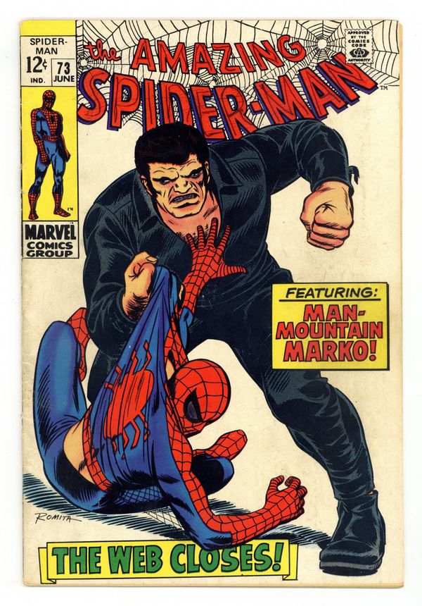 Starts Apr 4 First appearances of Silvermane and Man-Mountain Marko in "The Web Closes!" Plot by John Buscema and John Romita. Script by Stan Lee. Art by John Buscema (layouts) and Jim Mooney (finishes). Cover by John Romita. Spider-Man is in hot pursuit of the ancient clay tablet! And he receives atip from Captain Stacy -- that the Shocker's girlfriend may have it. The wall-crawler rushes to her apartment, but a new super-villain is already there: Man-Mountain Marko! The Maggia sent Marko to get the petrified tablet...and nobody is going to stop him! The web-slinger tries his best,but the raging bull grabs the tablet and takes it to his boss: Silvermane. Why does Silvermane want the tablet? And why does he need Dr. Curt Connors' help? Cameo appearances by Gwen Stacy, Caesar Cicero, Joe Robertson, Randy Robertson, and J. Jonah Jameson. (Notes: The letters page includes letters from comics historian Peter Sanderson and comics writer J.M. DeMatteis, respectively. This story was reprinted in Marvel Tales #54.) 36 pages. Cover price $0.12.