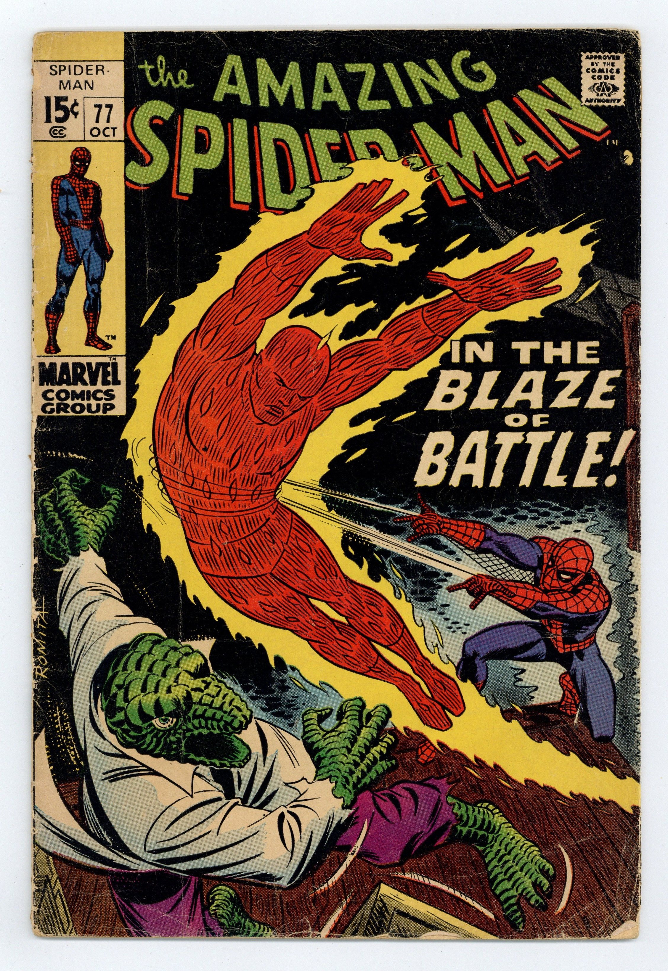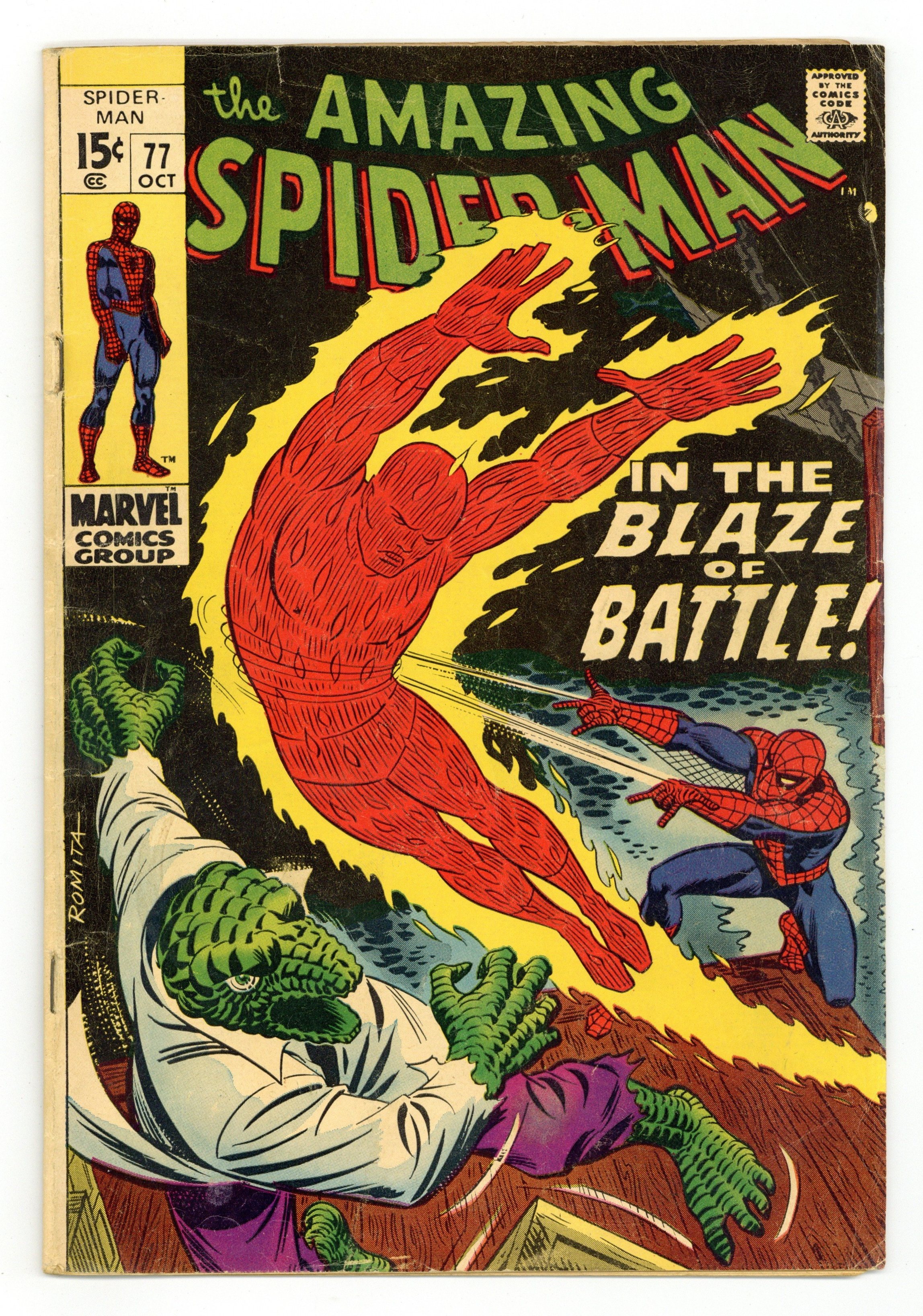 "In the Blaze of Battle!" Part 2 of 2. Guest-starring the Human Torch. Plot by John Buscema. Script by Stan Lee. Art by John Buscema (layouts) and Jim Mooney (finishes). Cover by John Romita. In the nick of time, the Human Torch arrives to interrupt the Lizard's attack! The web-slingershould be overjoyed, but he's not! Because Johnny Storm might accidentally hurt the Lizard during the fight. So as a result a confusing three-way battle takes place across the city! The Human Torch vs. the Lizard; Spider-Man vs. the Human Torch; and the Lizard vs. Spider-Man! How can thewall-crawler make sure everyone walks away a winner? Appearances by Billy Connors and Martha Connors. (Notes: Spider-Man tangles with the Lizard again in Amazing Spider-Man 102. The letters page includes a letter from comics writer Don McGregor. This issue was reprinted in Marvel Tales #58.) 36 pages. Cover price $0.15.