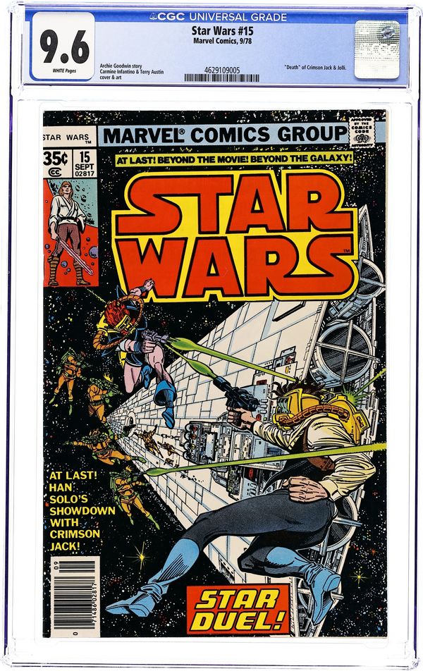 Tags: Star Wars$22.00"Star Duel!" Written by Archie Goodwin. Art by Carmine Infantino and Terry Austin. Han Solo has a final showdown with Crimson Jack and a cadre of space pirates in the cold void of space. This is one gun fight only one of these scoundrels will walk, or float as the case may be, away from. Cover price $0.35.