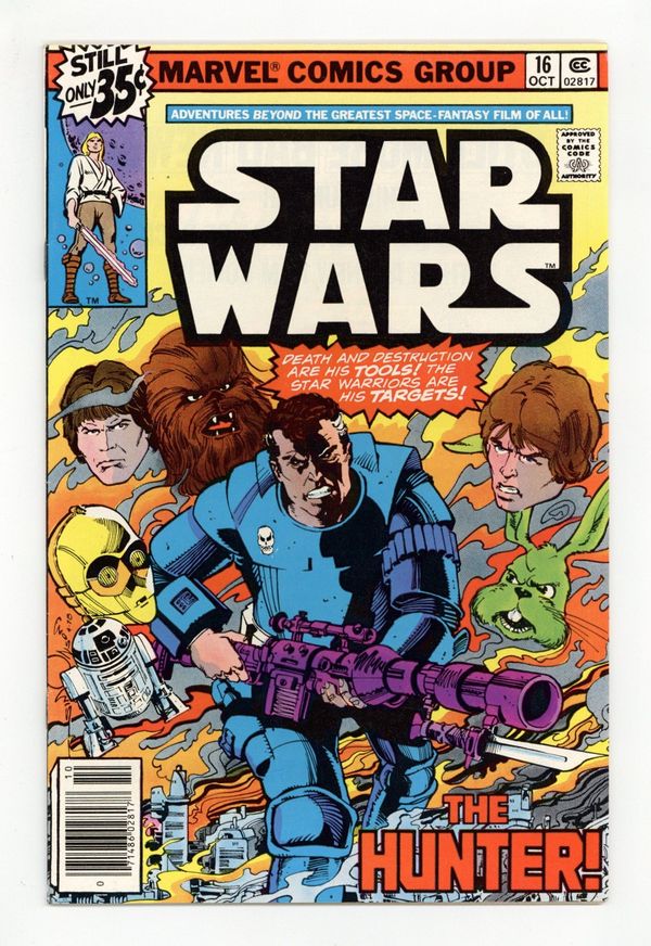 Tags: Star Wars$19.25"The Hunter!" Written by Archie Goodwin. Art and cover by Walt Simonson and Bob Wiacek. Luke, Han, and the other heroes of Star Wars have just been targeted by one of the deadliest bounty-hunters in the galaxy - Valance the Hunter. What is this assassin's secret that makes him so dangerous? The answer may shock you. Cover price $0.35.