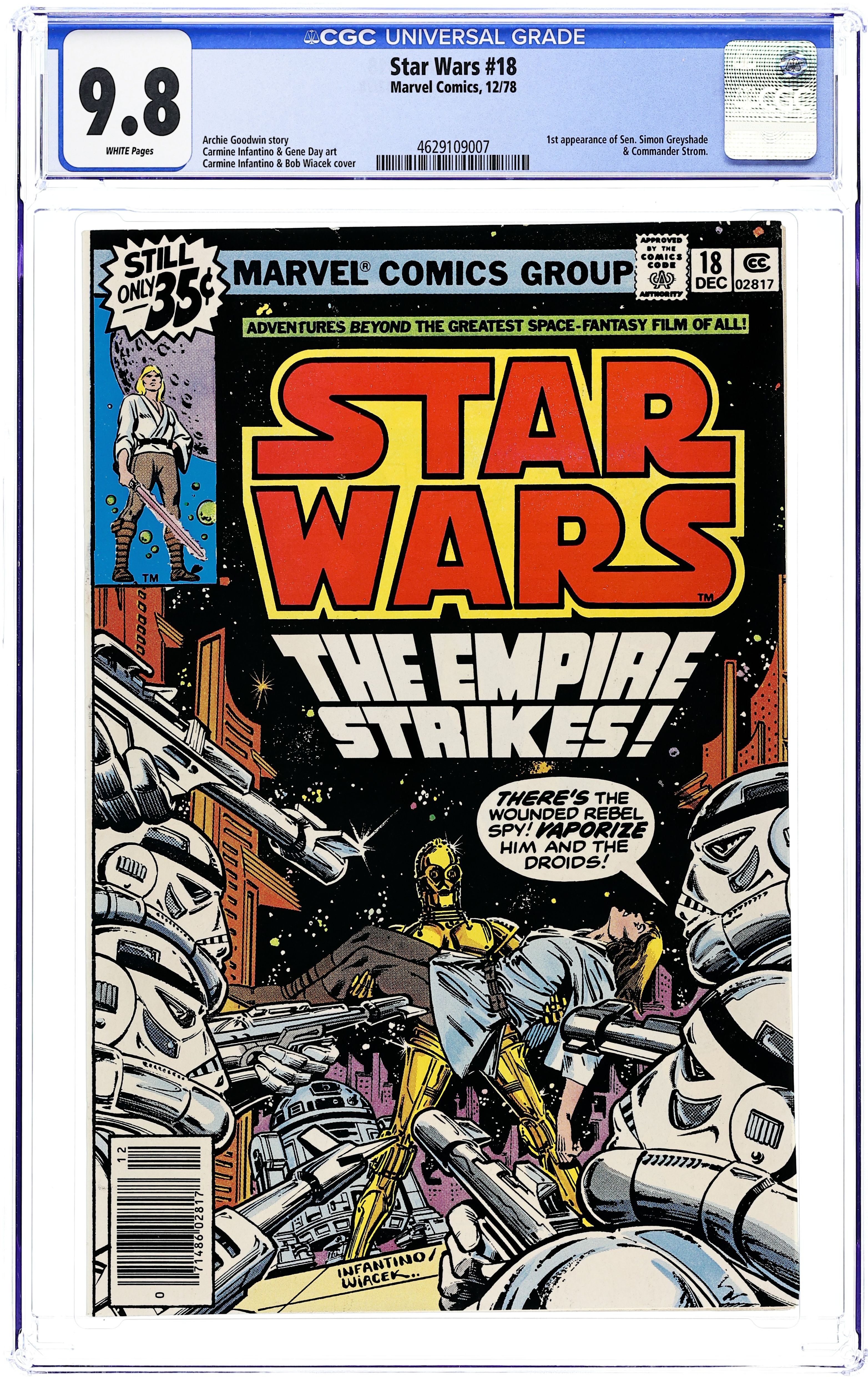 "The Empire Strikes!" Written by Archie Goodwin. Art by Carmine Infantino and Gene Day. After the destruction of the Death Star, Luke, Han, Leia, and the rest have become the most wanted people in the galaxy. So you can imagine the Empire's delight when the crew of the Millennium Falcon seemingly falls right into their grasp. Cover price $0.35.
