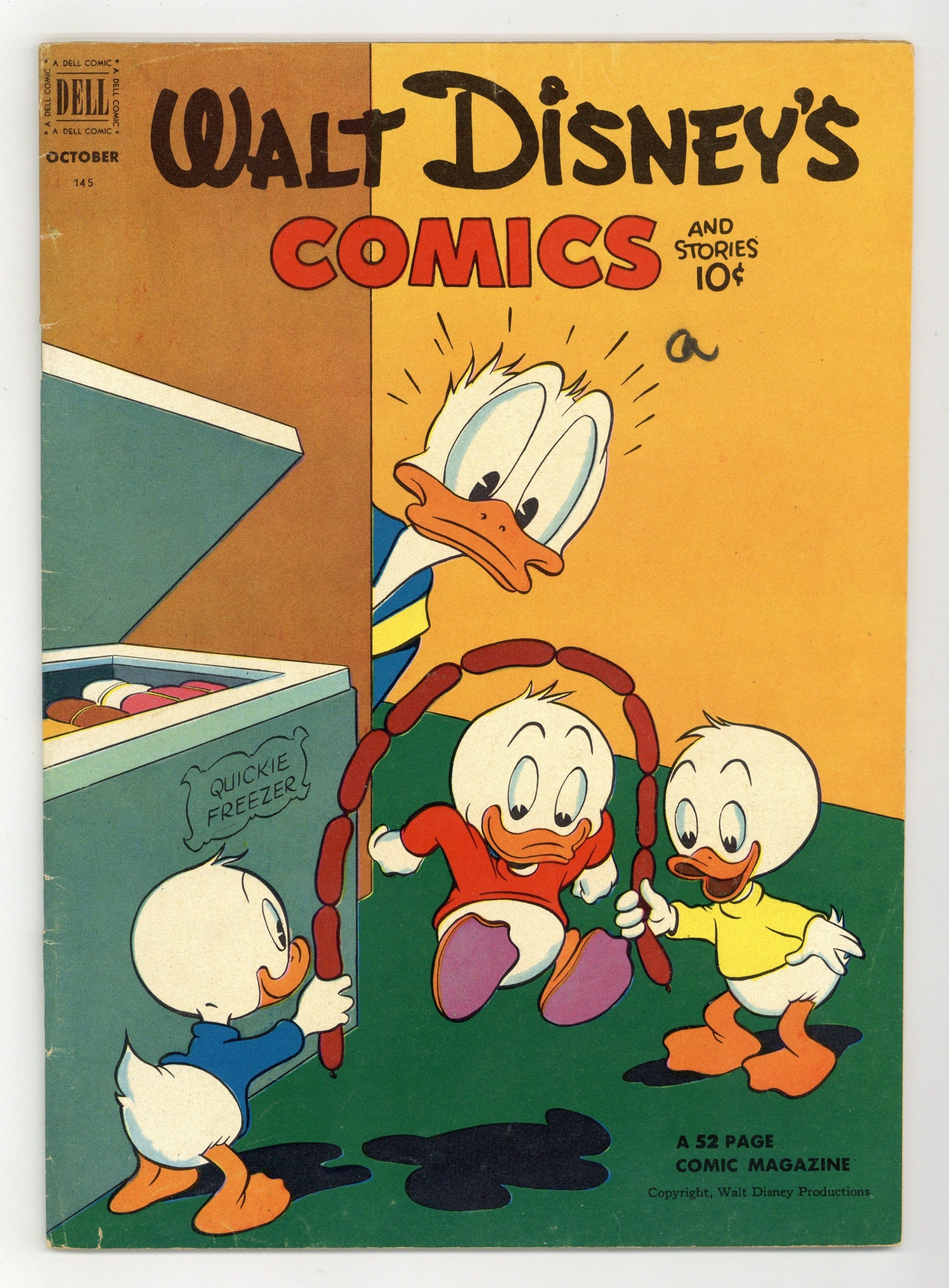 Cover by Carl Barks. Stories and art by Carl Barks, Bill Walsh, Manuel Gonzales, Bob Karp, Don Christensen, Frank McSavage, Gil Turner, Dick Hall, and Al Taliaferro. Sometimes listed as Vol. 13 #1. The long-running vehicle for Disney character comics featured art by Carl Barks, the legendary Good Duck Artist. Goofy finds a safe full of money hidden in his new house. In a story by Barks, Donald wants to use his nephews' hypno-gun on Uncle Scrooge. Grandma Duck mistakenly sells a bull to bullfighters. Donald Duck; Li'l Bad Wolf; Little Hiawatha; Hidden Treasure; Mickey Mouse: The Mysterious Pill Plot. 48 pages, Full Color. Cover price $0.10.