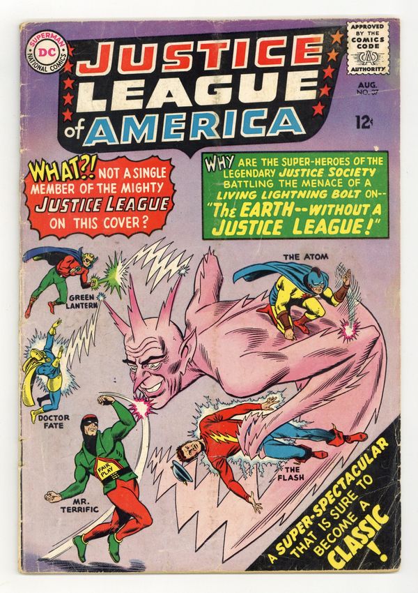 Cover pencils by Mike Sekowsky, inks by Murphy Anderson. Earth--Without a Justice League!, script by Gardner Fox, pencils by Mike Sekowsky, inks by Bernard Sachs; The Johnny Thunder of Earth-1 takes control of the Earth-2 counterpart's Thunderbolt after the Johnny of Earth-2 accidentally asks T-Bolt to transport him to Earth-1 to meet his counterpart (since he wondered if he had a counterpart on Earth-1 like the other heroes); The Earth-1 Johnny then goes back in time to prevent the JLAers from existing when they stop T-Bolt from committing crimes for him; After being defeated by the JSA later on, he has the Thunderbolt go back in time again to create a Lawless League (based off the JLA's origins) from his criminal associates to confront the JSA on Earth-1. Letter to the editor from comics writer Mike Friedrich. Rocky and Bullwinkle star in a one-page Cheerios ad. 36 pgs. $0.12. Cover price $0.12.