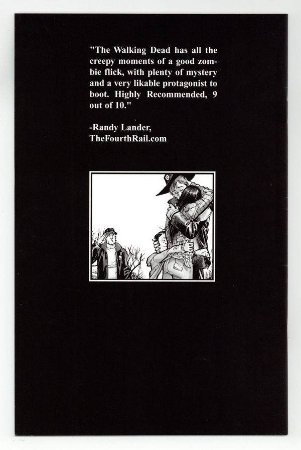 Starts Apr 20 (W) Robert Kirkman (A) Tony Moore BW 32pp Ongoing Monthly Series In stores the week of December 3rd. THE CONCEPT: How many hours are in a day when you don't spend half of them watching television? When is that last time any of us REALLY worked to get something that we wanted? How long has it been since any of us really NEEDED something that we WANTED? The world we knew is gone. The world of commerce and frivolous necessity has been replaced by a world of survival and responsibility. An epidemic of apocalyptic proportions has swept the globe, causing the dead to rise and feed on the living. In a matter of months society has crumbled, no government, no grocery stores, no mail delivery, no cable TV. In a world ruled by the dead, we are forced to finally begin living. THIS ISSUE: Rick Grimes' horrific adventure continues. Reunited with his family, his focus shifts from survival to protection. It's one thing to know that you have to watch your back every second of every day. It's another thing entirely to have to worry about losing your family in the blink of an eye. Rick's life has changed dramatically in the last couple months and so far, he's learned to deal with it... but is he finally starting to crack? From the guys behind BATTLE POPE and BRIT comes something COMPLETELY different. Cover price $2.95.