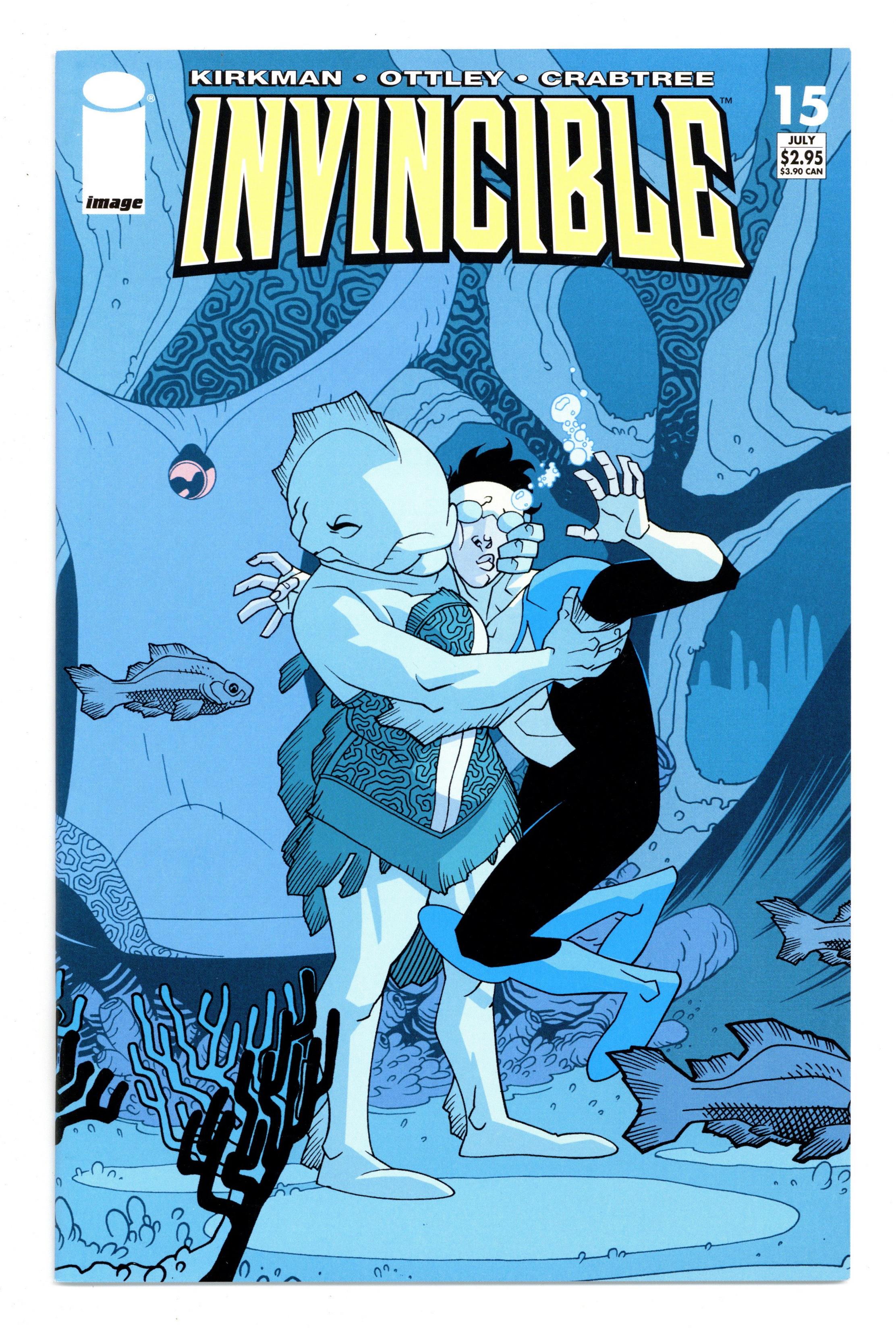 Written by ROBERT KIRKMAN Art by RYAN OTTLEY Cover by CORY WALKER & BILL CRABTREE FC 32 pgs. $2.95 Monthly ongoing series On sale X JULY, 2004 FROM THE WRITER OF CAPTAIN AMERICA! CONCEPT: Mark Grayson is just like most everyone else his age, except that his father is the most powerful superhero on the planet. And now he's begun to inherit his father's powers. It all sounds okay at first, but how do you follow in your father's footsteps when you know you will never live up to his standards? THIS ISSUE: Her decision is made up... her perfect mate is Invincible. No matter the cost... he must be hers. After her husband died in issue #7, Aquaria went through some bad times, but now that Mark has entered her life, everything is different, everything is perfect. Now Mark has to figure out how to let her know he's not interested... or legal. Cover price $2.95.