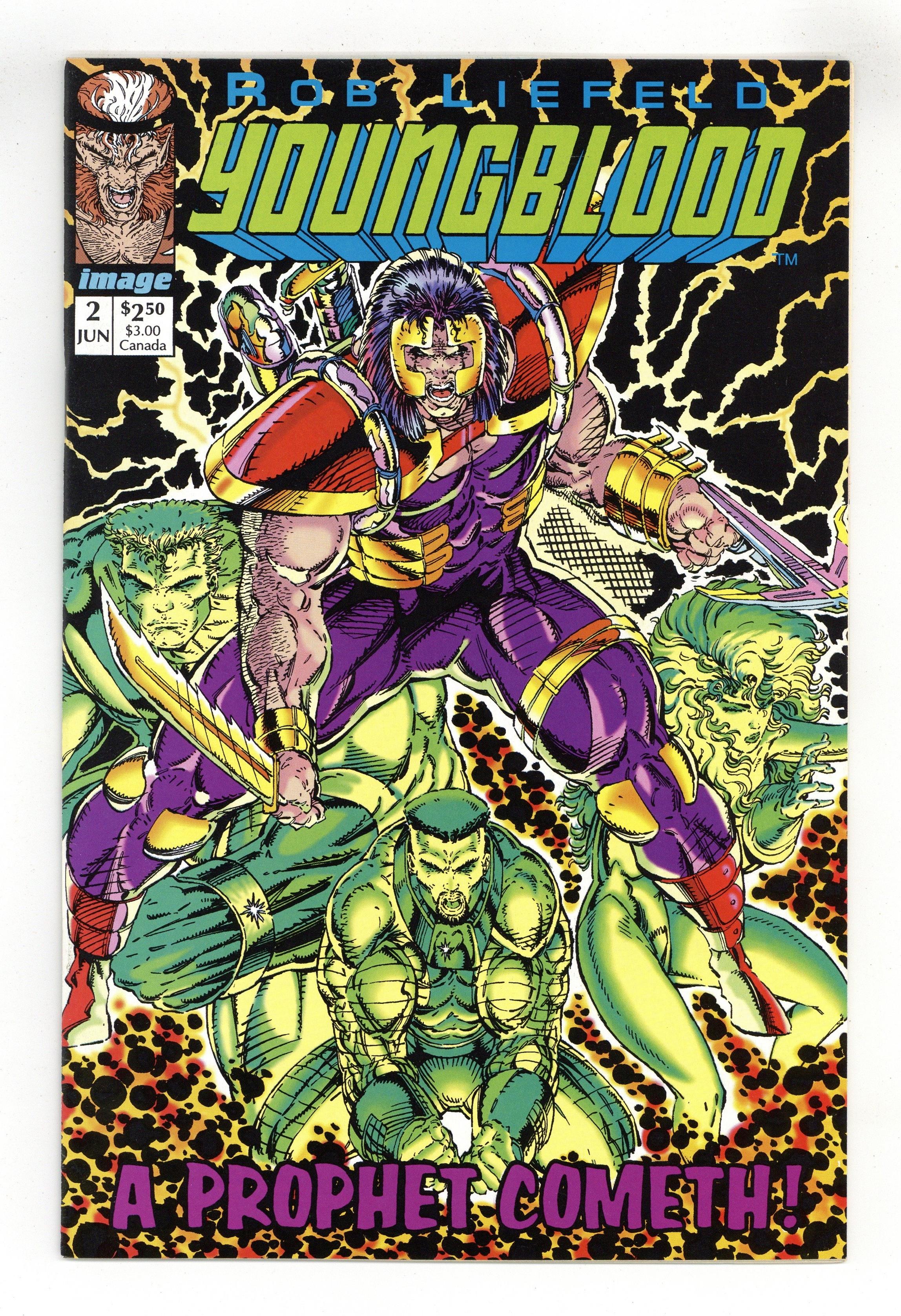 Tags: Flip Book (Cover Each Side), Youngblood Legacy Numbering (part 2)$24.00Guest-starring Prophet Story and art by Rob Liefeld. The rebel faction known as the Berserkers make a daring escape from the Death Squad, but who is the ominous Darkthorn. Meanwhile, Youngblood team members Sentinel, Brahma, Riptide, Cougar, and Combat awaken a super-soldier who has been in cryogenic sleep since the days of WWII. When John Prophet awakens disorientated and in a world he does not recognize, he mistakes Youngblood for his mortal enemies the Disciples and attacks. Plus, a 6 page back-up story introducing a new hero who stalks the criminal element at night, Shadow Hawk. Created, written, and drawn by Jim Valentino. 32 pages. Cover price $2.50.