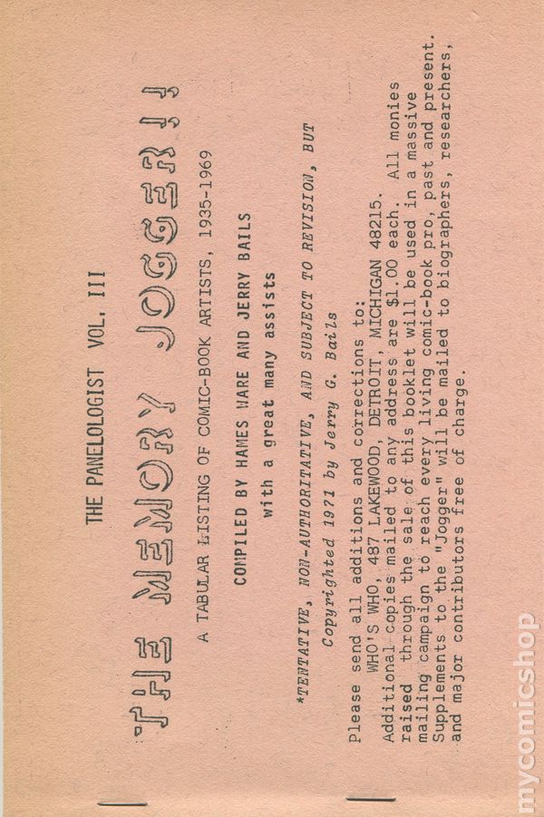 Volume 3. Fanzine created by Jerry Bails. The Memory Jogger!! A tabular listing of comic-book artists, 1935-1969. Compiled by Hames Ware and Jerry Bails. A comprehensive grid of comic artists and the publisher they worked for and during what time frame. Stapled pages, 8-1/2" x 5-1/2", 36 pages, B&W.