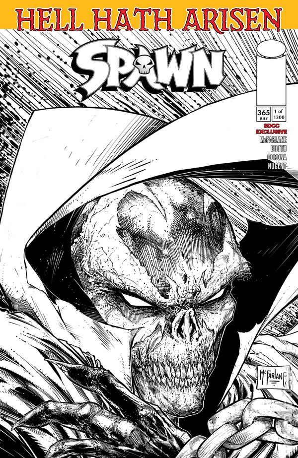 San Diego Comic Con B&W Sketch Edition Variant Cover by Todd McFarlane - limited to 1300 copies. Written by Todd McFarlane. Art by Brett Booth and Adelso Corona. Hell has broken free and is spilling out onto Earth. Angels and Demons are fighting in the streets. Only one man can put a stop to the carnage, SPAWN. 24 pages, full color.