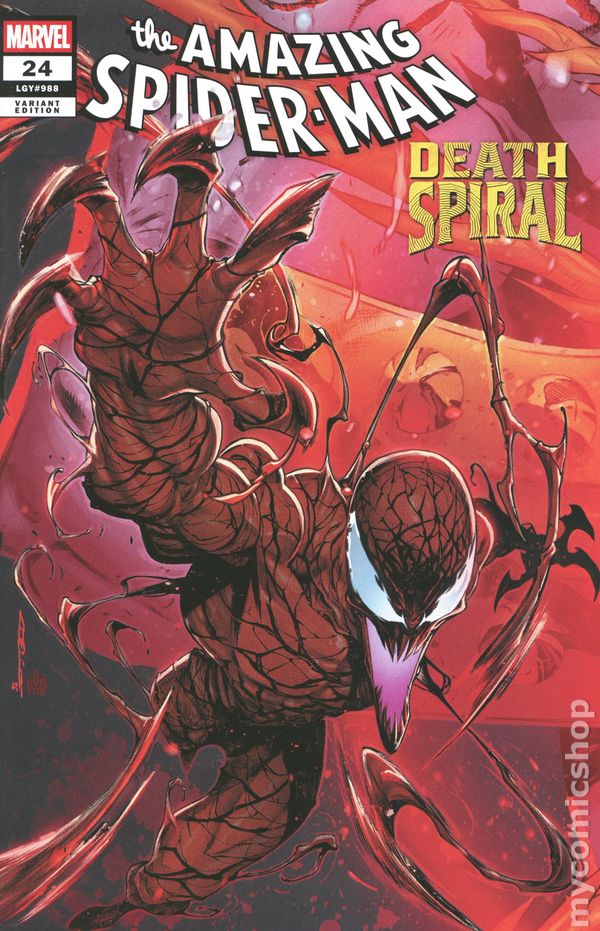 Limited 1 for 25 Retailer Incentive Variant Cover. (W) Joe Kelly (A) Jesus Saiz (CA) Doaly CARNAGE MEETS ITS MATCH!? DEATH SPIRAL PART FOUR! Carnage faces off against Torment while the serial killer's latest murder leaves the Spidey-Symbiote Alliance shaken. 32 pages, full color, rated T. Cover price $4.99.