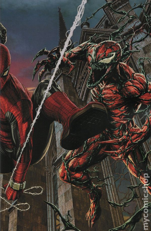 View scansLimited 1 for 100 Retailer Incentive Variant Cover. (W) Joe Kelly (A) Jesus Saiz (CA) Lee Bermejo CARNAGE MEETS ITS MATCH!? DEATH SPIRAL PART FOUR! Carnage faces off against Torment while the serial killer's latest murder leaves the Spidey-Symbiote Alliance shaken. 32 pages, full color, rated T. Cover price $4.99.
