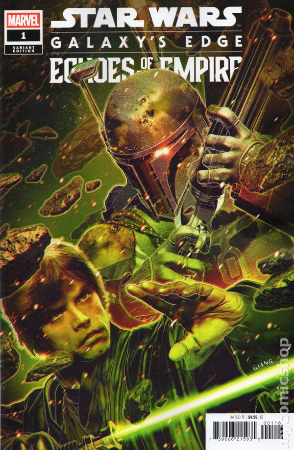 Limited 1 for 25 Retailer Incentive Variant Cover. (W) Ethan Sacks (A) Jethro Morales; Roi Mercado (CA) John Giang NEW SECRETS OF GALAXY'S EDGE REVEALED! LUKE SKYWALKER, PRINCESS LEIA and CHEWBACCA head to BATUU in search of important intel and stumble upon a dangerous relic - one that puts them on a collision course with the EMPIRE! Galaxy's Edge writer Ethan Sacks and artists Jethro Morales & Roi Mercado tell an all-new story inspired by Star Wars: Galaxy's Edge. Cover price $4.99.