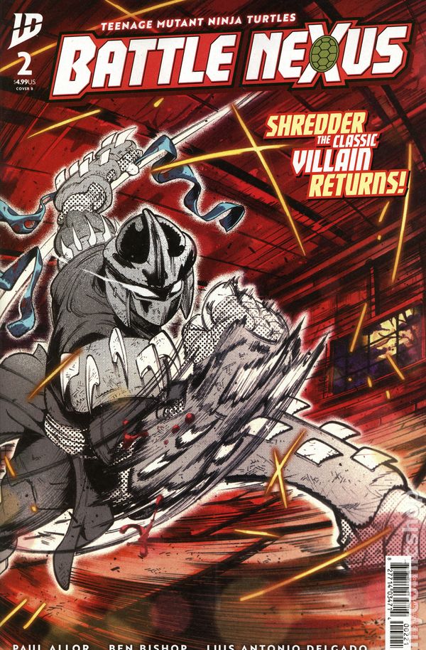 (W) Paul Allor (A) Ben Bishop (CA) Ricardo Ortiz Stranded in the Battle Nexus dimension by a twisted villain bent on annihilating every Ninja Turtle in the multiverse, the TMNT are forced to fight some of the greatest warriors of all time. In the first official bout, Ninja Turtle leader Leonardo is matched up with the TMNTs greatest enemy, the Shredder! But our Leo is surprised to discover this is not the Oroku Saki he knows so well, but someone entirely different…someone much more deadly…someone who hates him with a fire hes never felt before. Prepare yourself for the return of the most iconic and fearsome villain in Turtles history: Eastman & Lairds original Shredder! 32 pages, full color, not rated. Cover price $4.99.