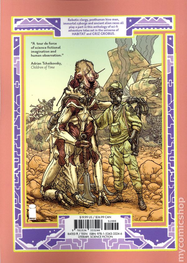 1st printing. Story and art by Simon Roy. A curious and peculiar collection of interconnected, character-driven sci-fi stories all set in the far future. Robotic clergy, posthuman hive-men, immortal cyborgs and ancient alien races all play a part in this collection of sci-fi adventure tales set in the universe of HABITAT and GRIZ GROBUS. This anthology collects "Hale-Bopp," "The Oxpecker and the Elephant," "Pride of the Central Republic," "A Portrait of The Artist As Hive Parasite," "The Ansible," "The Anchoress," and finally, "Vanguard". Softcover, 6-in. x 8 1/2-in., 184 pages, full color. Teen+ Cover price $19.99.