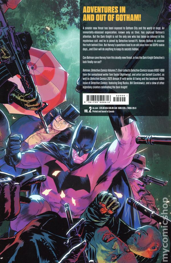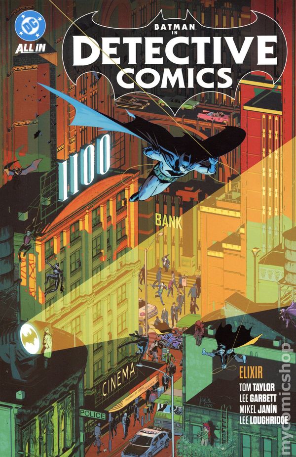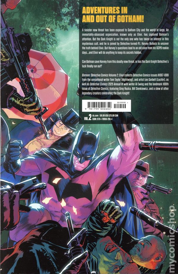 Volume 2 - 1st printing. "Elixir!" Collects Detective Comics (2016 3rd Series) #1,097-1,100 and Detective Comics (2016 3rd Series) Annual #1. Written by Tom Taylor, Al Ewing, Joshua Hale Fialkov, Greg Rucka, Mariko Tamaki, and Dan Watters. Art by Lee Garbett, Mikel Janin, Alvaro Martinez Bueno, John McCrea, Amancay Nahuelpan, Mike Norton, Fico Ossio, Srefano Raffaele, and Bill Sienkiewicz. Cover by Mikel Janin. Adventures in and out of Gotham! A sinister new threat has been exposed to Gotham City and the world at large. An immortality-obsessed organization, known only as Elixir, has captured Batman's attention. But the Dark Knight is not the only one who has taken an interest in this mysterious cult, and he is joined by Detective-turned-P.I. Harvey Bullock to uncover the truth behind Elixir. But Harveys questions lead to an old case from his GCPD rookie days...and Elixir will do anything to keep its secrets hidden. Can Batman save Harvey from this deadly new threat, or has the Dark Knight Detectives luck finally run out? Softcover, 184 pages, full color. Teen Cover price $19.99.