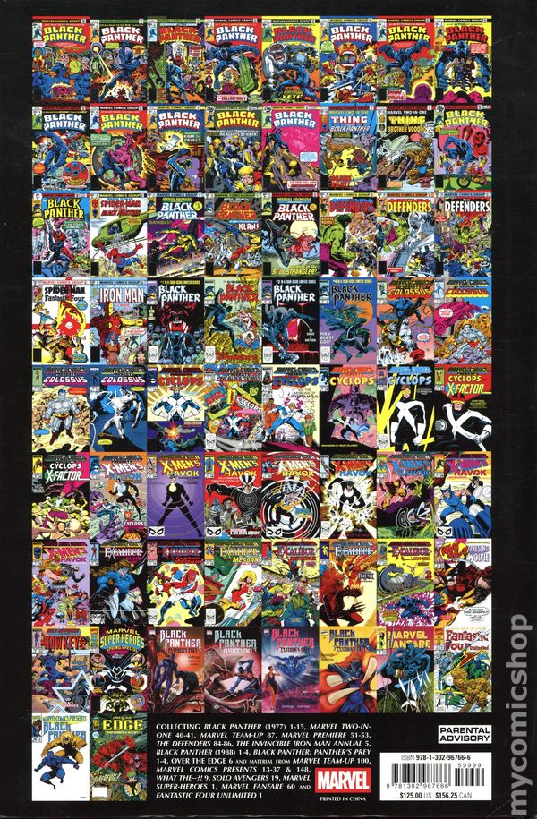 1st printing. Collects Black Panther (1977-1979 Marvel 1st Series) #1-15, Marvel Two-in-One (1974-1983 1st Series) #40-41, Marvel Team-Up (1972-1985 1st Series) #87, Marvel Premiere (1972-1981) #51-53, The Defenders (1972-1986 1st Series) #84-86, Iron Man (1968-1996 1st Series) Annual #5, Black Panther (1988 Marvel Mini-Series) #1-4, Black Panther: Panther's Prey (1991 Marvel) #1-4; material from Marvel Team-Up (1972-1985 1st Series) #100; Marvel Comics Presents (1988-1995) #13-37 and 148; What The--?! (1988-1993) #9; Solo Avengers (1987-1989 Marvel) #19; Marvel Super Heroes (1990-1993 2nd Series) #1; Marvel Fanfare (1982-1992 1st Series) #60; Fantastic Four Unlimited (1993-1995 Marvel) #1. Written by Jack Kirby, Ed Hannigan, Peter B. Gillis, Don McGregor, Jim Shooter, Roger Slifer, Tom DeFalco, David Anthony Kraft, Steven Grant, Chris Claremont, John Byrne, Sandy Plunkett, Ralph Macchio, Richard Bensam, Walt Simonson, Roy Thomas, Don Hillsman, and David DeVries. Art by Jack Kirby, Jerry Bingham, Gene Colan, Denys Cowan, Dwayne Turner, Ron Wilson, Don Perlin, John Byrne, Mike Harris, Sandy Plunkett, Ron Lim, Dave Hoover, Robert Brown, Mike Royer, Gene Day, Pablo Marcos, Frank Springer, Al Gordon, Tex Blaisdell, Jim Mooney, Bob McLeod, Dan Green, Sam De La Rosa, Tom Palmer, Scott Hampton, Jim Sanders III, Walt Simonson, Charles Barnett III, Don Hillsman, and Mike Witherby. Cover by Jack Kirby and Ernie Chan. Two decades of Black Panther stories in one action-packed volume! Return to Wakanda for more tales of the Black Panther — beginning with TChalla setting off on far-out adventures that could only be conceived by his legendary co-creator, Jack Kirby! The King of Comics sets the King of Wakanda on an epic quest to discover the startling secret of King Solomons Frog that sees him encounter alien races, battle eternal samurai warriors and more! Then brace yourself for an epic battle between the Black Panther, the Avengers and Ulysses Klaw! TChalla returns to the American South to root out the evil Soul Stranglers cult! And things get personal as the Panthers search for his long-lost mother leads him on a brutal hunt like no other set against the violence of South African apartheid. Back in Wakanda, the winged menace called Solomon Prey swears vengeance on the king! Plus: The Panther prowls in a series of rarely seen tales! Hardcover, 8 1/2-in. x 11-in., 1,272 pages, full color. Cover price $125.00.