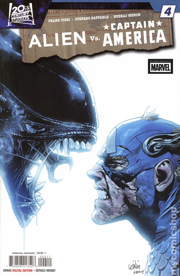 (W) Frank Tieri (A) Stefano Raffaele (CA) Mateus Manhanini Now that OPERATION: RED KING has been revealed and HYDRA'S plan for the XENOMORPHS has taken shape, will CAPTAIN AMERICA be able to stop the RED SKULL and his ALIEN army…or will the ALLIES lose the war, forever changing history as we know it? Find out in the shocking, chest bursting finale to the crossover of the millennium! 32 pages, full color, RATED PARENTAL ADVISORY. Cover price $4.99.