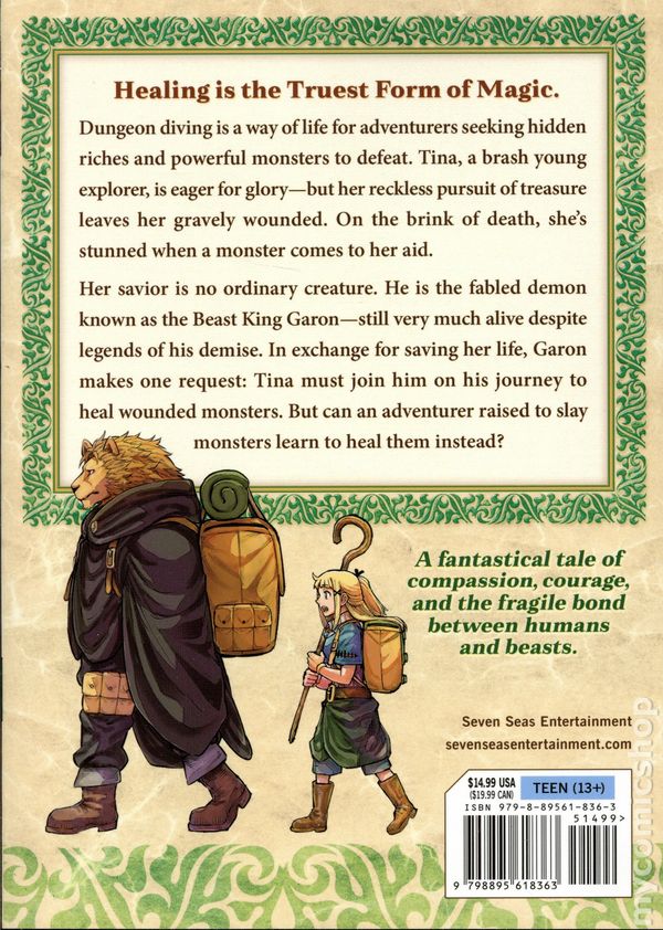 Volume 1 - 1st printing. Written by Tatsukazu Konda. Art and cover by Asahi Sakano. Character Designs by Momochichi. Translated by Adrienne Beck. The story of a Beast King intent on protecting monsters—and his human companion. Dungeon diving is a way of life for adventurers seeking hidden riches and powerful monsters to defeat. Tina, a brash young explorer, is eager for glory—but her reckless pursuit of treasure leaves her gravely wounded. On the brink of death, shes stunned when a monster comes to her aid. Her savior is no ordinary creature. He is the fabled demon known as the Beast King Garon—still very much alive despite legends of his demise. In exchange for saving her life, Garon makes one request: Tina must join him on his journey to heal wounded monsters. But can an adventurer raised to slay monsters learn to heal them instead? Softcover, 5 1/2-in.x 8-in., 214 pages, B&W. Rated T Cover price $14.99.