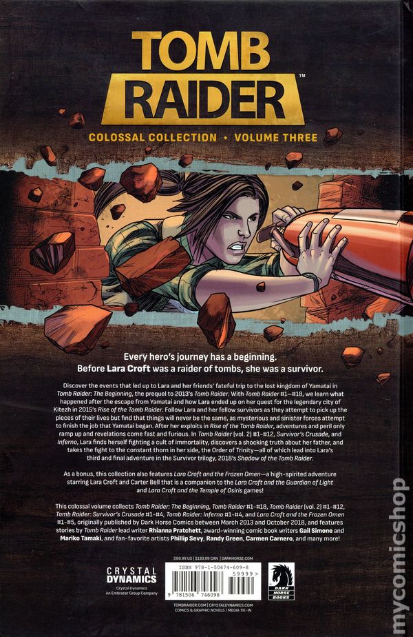 Volume 3 - 1st printing. Collects Tomb Raider: The Beginning, Tomb Raider (2014) #1-18, Tomb Raider (2016 Dark Horse) #1-12, Tomb Raider: Survivors Crusade (2017 Dark Horse) #1-4, Tomb Raider: Inferno (2018 Dark Horse) #1-4, and Lara Croft and the Frozen Omen (2015) #1-5. Written by Gail Simone, Rhianna Pratchett, Mariko Tamaki, Jackson Lanzing, Collin Kelly, and Corinna Bechko. Art by Nicolas Daniel Selma, Juan Gedeon, Derlis Santacruz, Andy Owens, Phillip Sevy, Ashley A. Woods, and Randy Green. Cover by Tula Lotay. Back Cover by Phillip Sevy. The third and final colossal collection of Tomb Raider comics! Every heros journey has a beginning. Before Lara Croft was a raider of tombs, she was a survivor. Discover the events that led up to Lara and her friends fateful trip to the lost kingdom of Yamatai in Tomb Raider: The Beginning, the prequel to 2013s Tomb Raider. With Tomb Raider #1–#18, we learn what happened after the escape from Yamatai and how Lara ended up on her quest for the legendary city of Kitezh in 2015s Rise of the Tomb Raider. Follow Lara and her fellow survivors as they attempt to pick up the pieces of their lives, but find that things will never be the same, as mysterious and sinister forces attempt to finish the job that Yamatai began. After her exploits in Rise of the Tomb Raider, adventures and peril only ramp up and revelations come fast and furious. In Tomb Raider (vol. 2) #1-#12, Survivors Crusade, and Inferno, Lara finds herself fighting a cult of immortality, discovers a shocking truth about her father, and takes the fight to the constant thorn in her side, the Order of Trinity—all of which lead into Laras third and final adventure in the Survivor trilogy, 2018s Shadow of the Tomb Raider. As a bonus, this collection also features Lara Croft and the Frozen Omen—a high-spirited adventure starring Lara Croft and Carter Bell that is a companion to the Lara Croft and the Guardian of Light and Lara Croft and the Temple of Osiris games! This colossal, hardcover volume collects Tomb Raider stories originally published by Dark Horse Comics between March 2013 and October 2018 and features stories by Tomb Raider lead writer Rhianna Pratchett, award-winning comic-book writers Gail Simone, and Mariko Tamaki, and fan-favorite artists Phillip Sevy, Randy Green, Carmen Carnero, and many more! Hardcover, 1,144 pages, full color. Rated 14+ Cover price $99.99.
