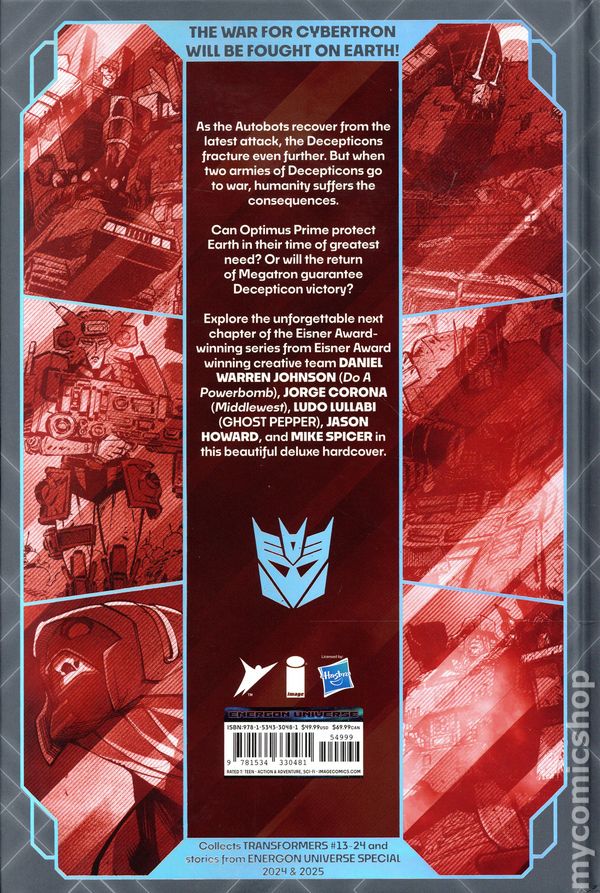 Volume 2 - 1st printing. Collects Transformers (2023 Image) #13-24 and stories from Energon Universe Special (2024 Image) and Energon Universe Special (2025 Image). Written by Daniel Warren Johnson. Art by Daniel Warren Johnson, Jorge Coronar, Ryan Ottley, Jason Howard, and Ludo Lulliabi. Cover by Jorge Coron. THE WAR FOR CYBERTRON WILL BE FOUGHT ON EARTH! As the Autobots recover from the latest attack, the Decepticons fracture even further. But when two armies of Decepticons go to war, humanity suffers the consequences. Can Optimus Prime protect Earth in their time of greatest need? Or will the return of Megatron guarantee Decepticon victory? Explore the unforgettable next chapter of the Eisner Award-winning series from critically acclaimed creative team DANIEL WARREN JOHNSON (DO A POWERBOMB!, THE MOON IS FOLLOWING US), JORGE CORONA (MIDDLEWEST), LUDO LULLABI (BATTLE CHASERS, GHOST PEPPER), JASON HOWARD (ASTOUNDING WOLF-MAN, TREES), and MIKE SPICER in this beautiful deluxe hardcover. Hardcover, 8 1/2-in. x 11-in., 288 pages, full color. Teen Cover price $49.99.