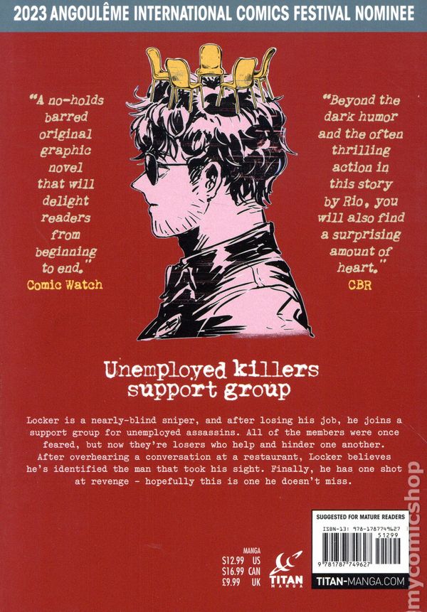 1st printing. Story and art by Rio. Translated by Vanessa Liu. A bold, bloody, and brilliantly offbeat ride through the lives of societys most dangerous burnouts. Welcome to the group—check your conscience at the door. Locker Loyed, once a deadly sniper, lost his vision—and his job—on a mission gone wrong. Now, he's joined an unlikely circle of former contract killers, each grappling with their own personal collapse. Among them: Gloria Maze, a meticulous assassin whose career imploded after catching her husband cheating and killing the mistress in a jealous rage; Jerry Cole, a justice-obsessed lawyer turned bloodthirsty executioner; and Jordi Joe, a delusional con man who's never actually killed anyone. Softcover, 5-in. x 7-in., 256 pages, full color. Mature Readers Cover price $12.99.