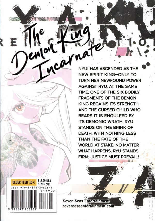 Volume 15 - 1st printing. Written by Takeshi Natsuhara. Art and cover by Hiroki Miyashita. Translated by Giuseppe di Martino. Adapted by Jennifer Geisbrecht. THE DEMON KING INCARNATE! Nyui has ascended as the new Spirit King—only to turn her newfound power against Ryu. At the same time, one of the six bodily fragments of the demon king regains its strength, and the cursed child who bears it is engulfed by its demonic wrath. Ryu stands on the brink of death, with nothing less than the fate of the world at stake. No matter what happens, Ryu stands firm: Justice must prevail! Softcover, 5-in. x 7-in., 192 pages, B&W. Older Teen (15+) Cover price $13.99.