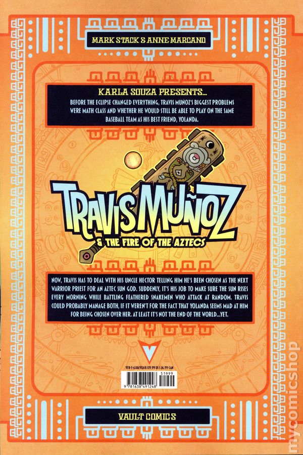 Volume 1 - 1st printing. Written by Mark Stack. Art and cover by Anne Marcano. Karla Souza presents… TRAVIS MUÑOZ AND THE FIRE OF THE AZTECS A middle grade graphic novel about Aztec mythology, best friends, and baseball—from breakout creators Mark Stack and Anne Marcano! Before the eclipse changed everything, Travis Muñoz's biggest problems were math class and whether he would still be able to play on the same baseball team as his best friend Yolanda. Now, Travis has to deal with his uncle Hector telling him he's been chosen as the next warrior priest for an Aztec sun god. Which means, its his job to make sure the sun rises every morning. And his job to battle feathered snakemen who attack at random. Travis could probably manage both, if it weren't for the fact that Yolanda seems mad at him for being chosen over her. At least it's not the end of the world…yet. Softcover, 208 pages, full color. Teen Cover price $19.99.