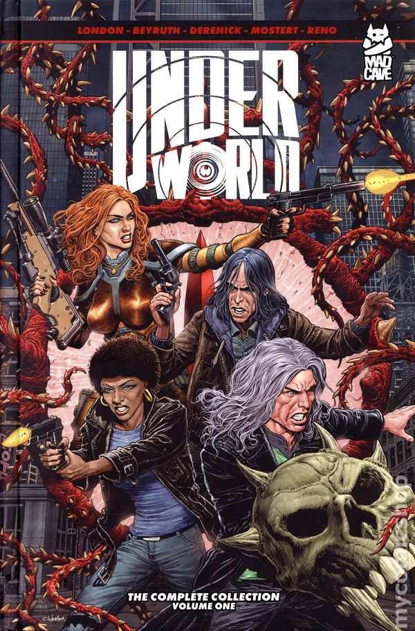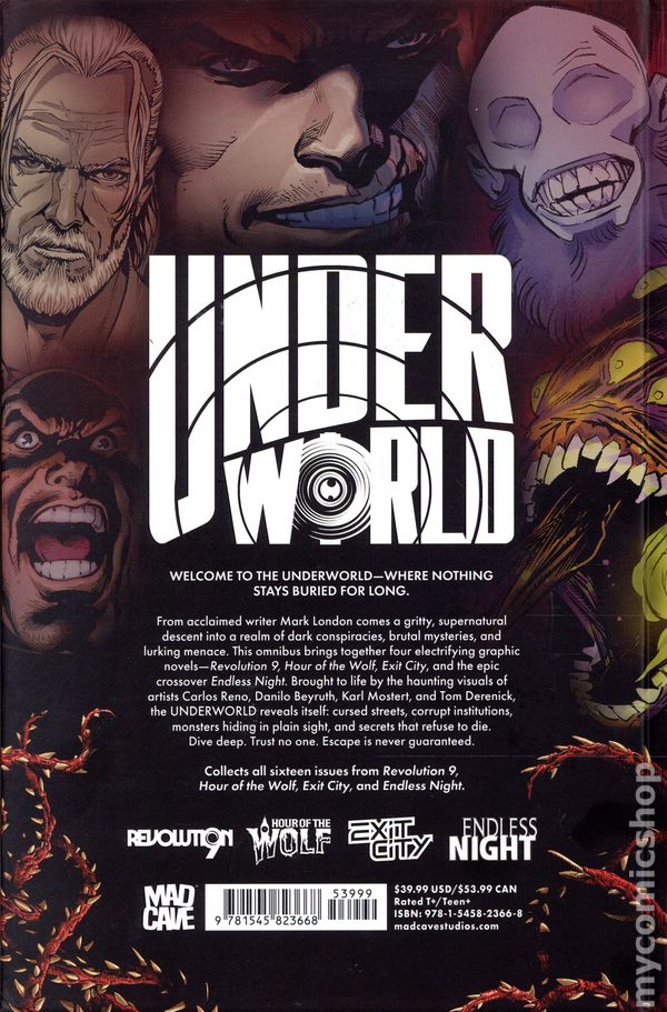Volume 1 - 1st printing. Collects Revolution 9 (2024 Mad Cave) #1-4, Hour of the Wolf (2024 Mad Cave) #1-4, Exit City (2024 Mad Cave) #1-4, and Endless Night (2025 Mad Cave) #1-4. Written by Mark London. Art by Carlos Reno, Danilo Beyrouth, Karl Mostert, Ramon Villalobos, and Tom Derenick. Cover by Chris Weston. WELCOME TO THE UNDERWORLD—WHERE NOTHING STAYS BURIED FOR LONG.From acclaimed writer Mark London comes a gritty, supernatural descent into a realm of dark conspiracies, brutal mysteries, and lurking menace. This omnibus brings together four electrifying graphic novels—Revolution 9, Hour of the Wolf, Exit City, and the epic crossover Endless Night. Brought to life by the haunting visuals of artists Carlos Renoi, Danilo Beyruth, Kalr Mostert, and Tom Derenick, the UNDERWORLD reveals itself: cursed streets, corrupt institutions, monsters hiding in plain sight, and secrets that refuse to die. Dive deep. Trust no one. Escape is never guaranteed. Hardcover, 384 pages, full color. Teen+ Cover price $39.99.