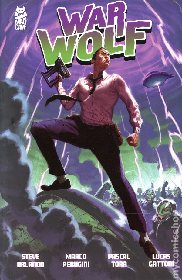 1st printing. Collects War Wolf (2025 Mad Cave) #1-4. Written by Steve Orlando. Art by Marco Perugini. Cover by David Talaski. Thomas Bruin. A man plucked from obscurity by circumstance, who saves his town from an alien scout team, and then makes an unholy bargain to save the world from the invasion that follows. This alchemy of actions and secrets makes Bruin a worldwide celebrity, which he leverages to his advantage, but theres just one problem– the clocks ticking. Because only Bruin knows that he didnt truly defeat the aliens so many decades ago, and as he reaches the twilight of his career, the bill comes due. Softcover, 104 pages, full color. Mature Readers Cover price $17.99.