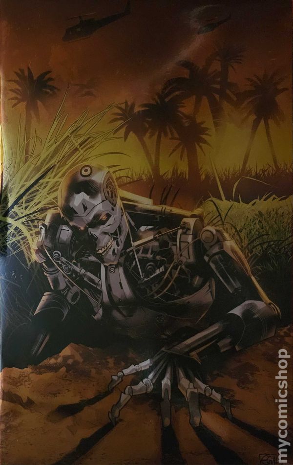 Foil Cover. Written by Declan Shalvey. Art by David O'Sullivan. Cover by Declan Shalvey. Saigon, 1975-The war is winding down, and American forces are in retreat. One G.I. is enjoying his final leave in South Vietnam's capital city when he is urgently recalled to the front. Back on the line, Private Duggan finds that his sector is being overrun by a mysterious enemy force one that doesn't operate like any Viet Cong or NVA unit he's ever faced. As rumors spread through the ranks about a 'one-man Charlie platoon,' Duggan and his squad suddenly come under murderous fire. Through the thick jungle air the trapped men spy their attacker a lone figure, seemingly impervious to bullets and grenades, completely devoid of fear or hesitation. Implacable. Inescapable. Inhuman. Author DECLAN SHALVEY (ThunderCats, Alien) and artist LUKE SPARROW (Star Trek) get down in the mud with the second issue of their hotly anticipated new Terminator series, opening a groundbreaking new front in the war against the machines and featuring bulletproof covers from SHALVEY, EDWIN GALMON, DREW MOSS, and DAVID COUSENS! 32 pages, full color. Rated T+ Cover price $9.99.